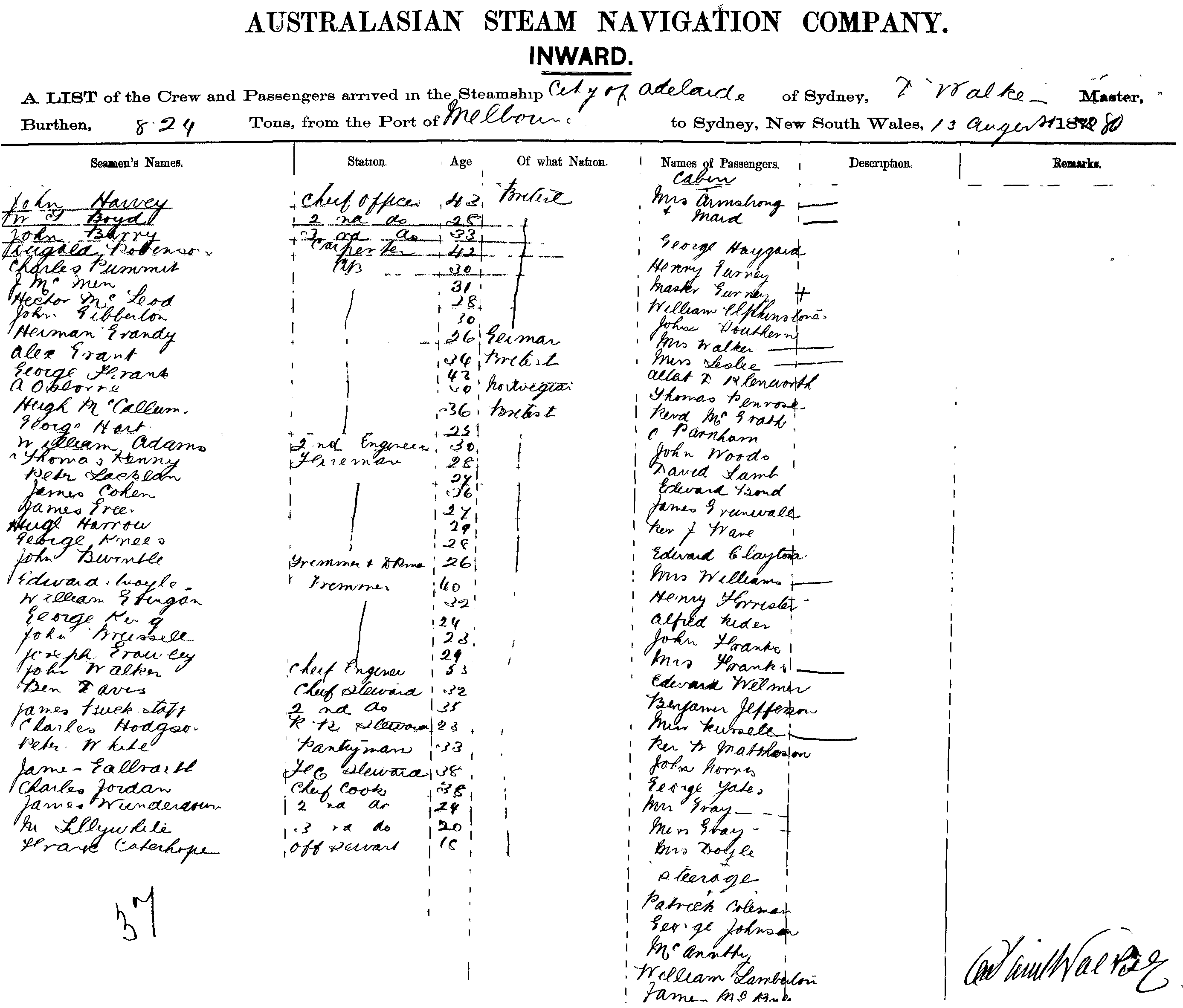 CITY OF ADELAIDES. S. OF SYDNEY, DAVID WALKER, MASTER, BURTHEN 524 TONS FROM THE PORT OF MELBOURNE TO SYDNEY, NEW SOUTH WALES, 13TH AUG. 1880 |