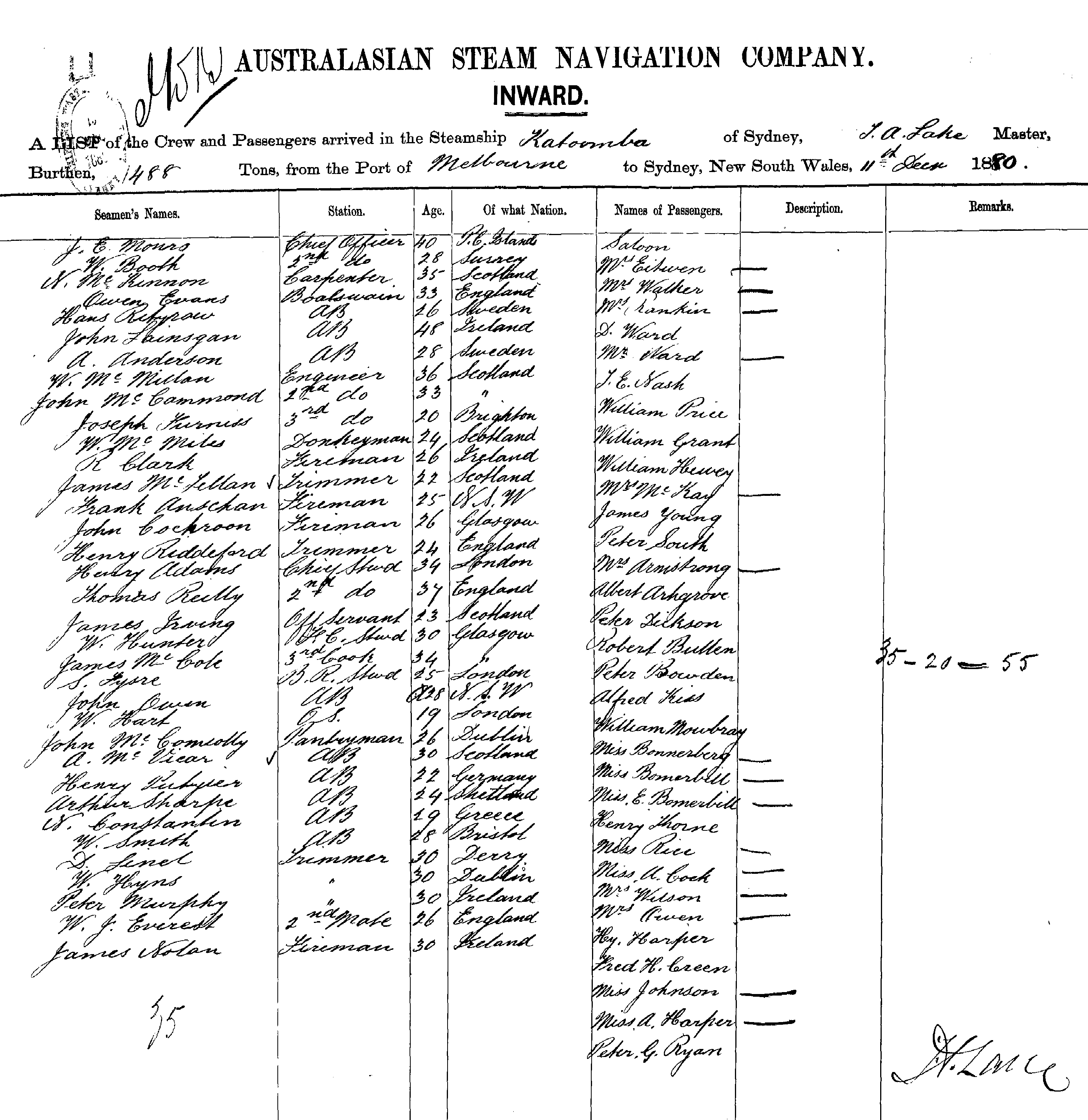 KATOOMBAOF SYDNEY, T. A. LAKE, MASTER, BURTHEN 488 TONS FROM THE PORT OF MELBOURNE TO SYDNEY, NEW SOUTH WALES, 11TH DEC. 1880 |