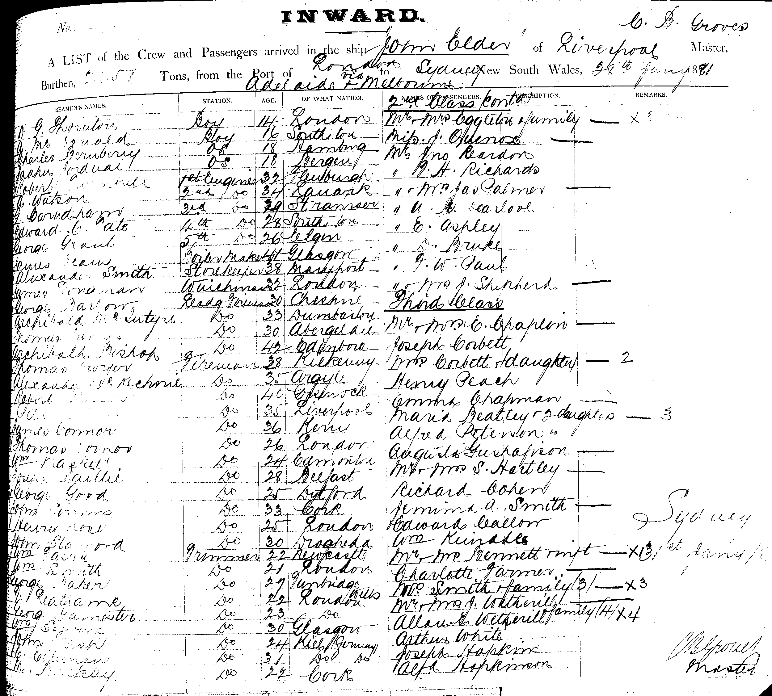 JOHN ELDEROF LIVERPOOL, CHARLES BAYLES GROVES, MASTER, BURTHEN 2651 ? TONS FROM THE PORT OF LONDON TO SYDNEY VIA ADELAIDE & MELBOURNE, NEW SOUTH WALES, 28TH JANUARY 1881 |