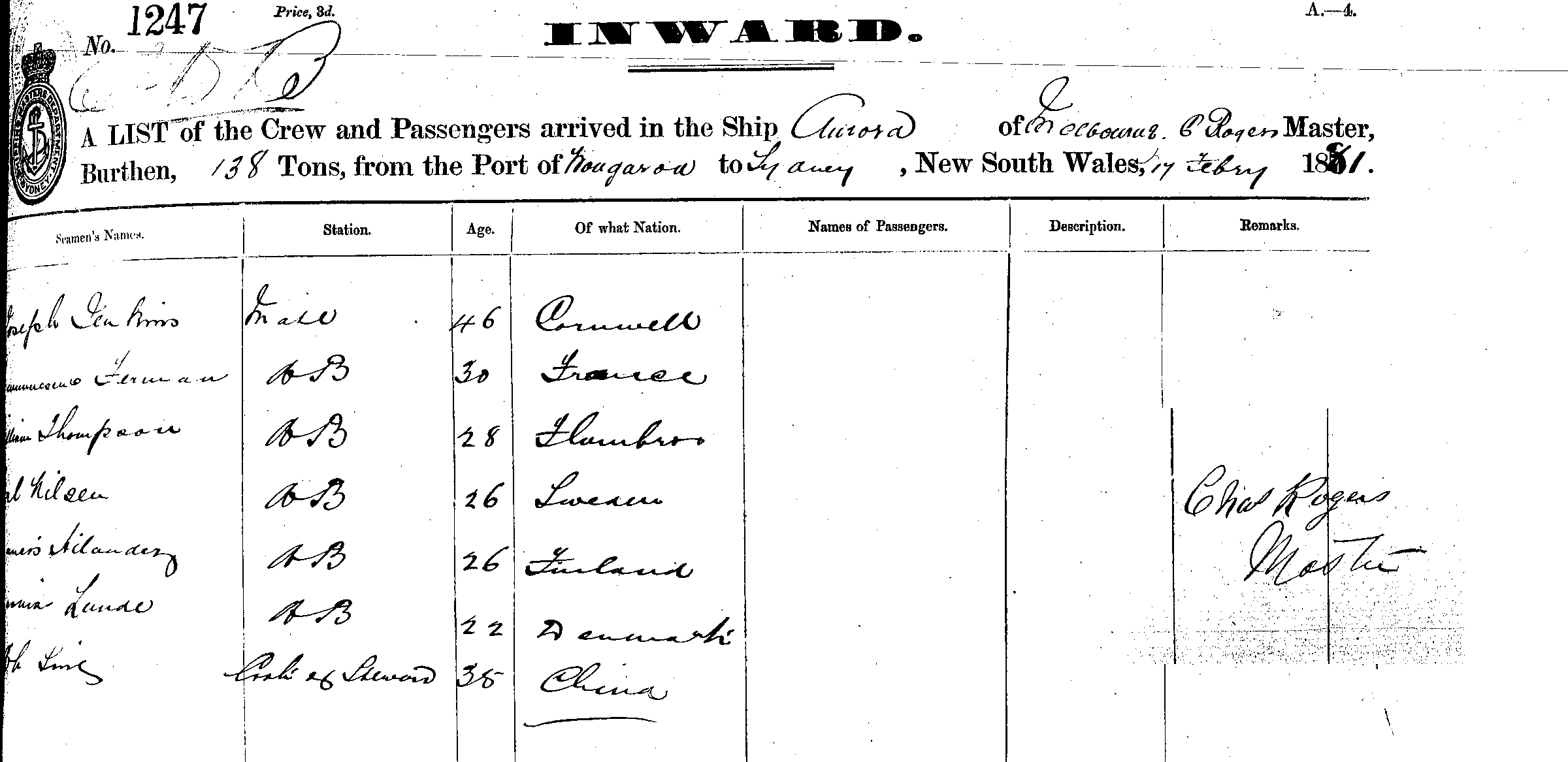 OF MELBOURNE, C.ROGERS, MASTER, BURTHEN 138 TONS FROM THE PORT OF NANGAROA ? TO SYDNEY, NEW SOUTH WALES, 17 FEBRY, 1881 |