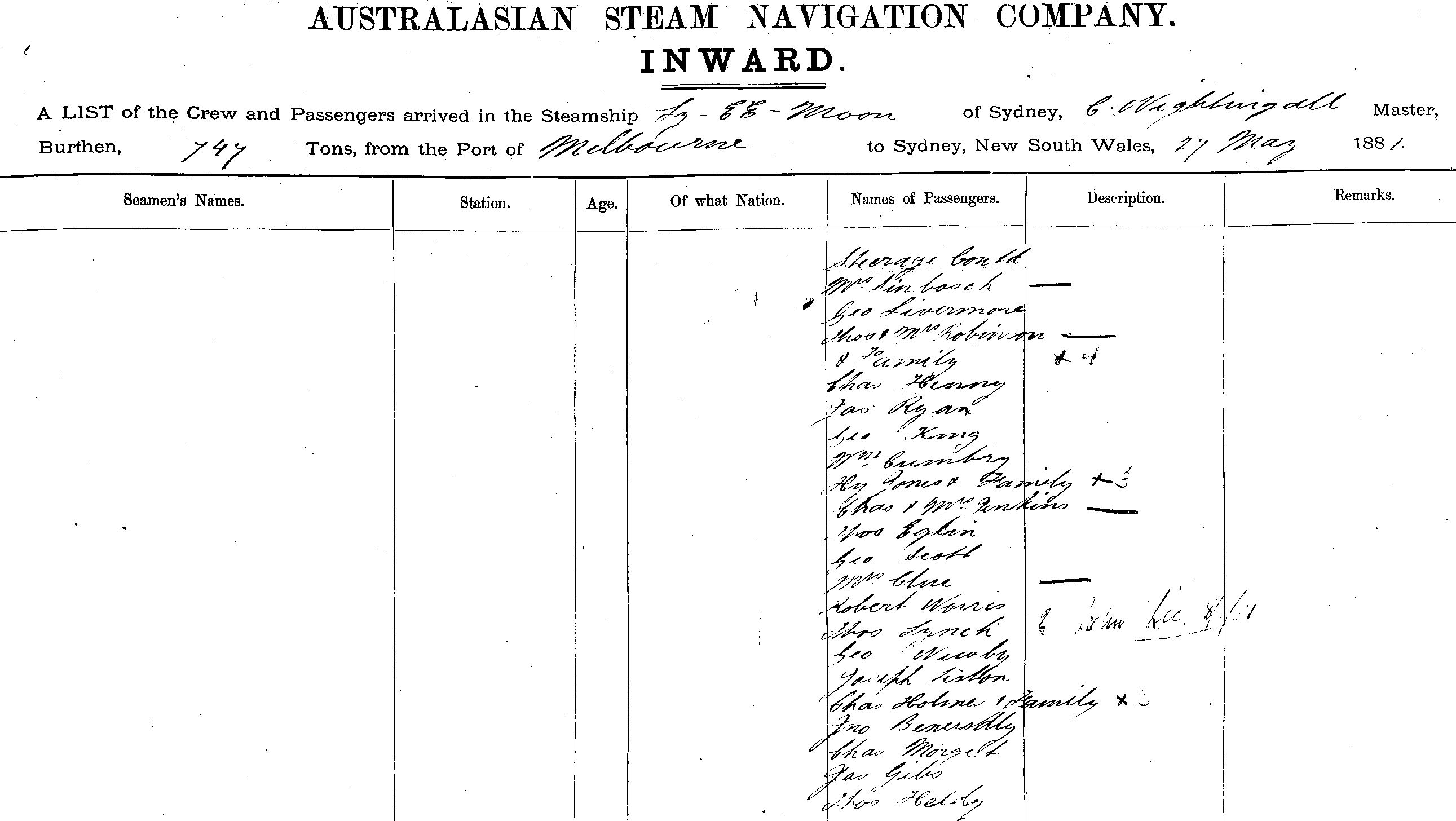 LY-EE-MOONOF SYDNEY, CHAS NIGHTINGALL, MASTER, BURTHEN 747 TONS FROM THE PORT OF MELBOURNE TO SYDNEY, NEW SOUTH WALES, 27 MAY 1881 |