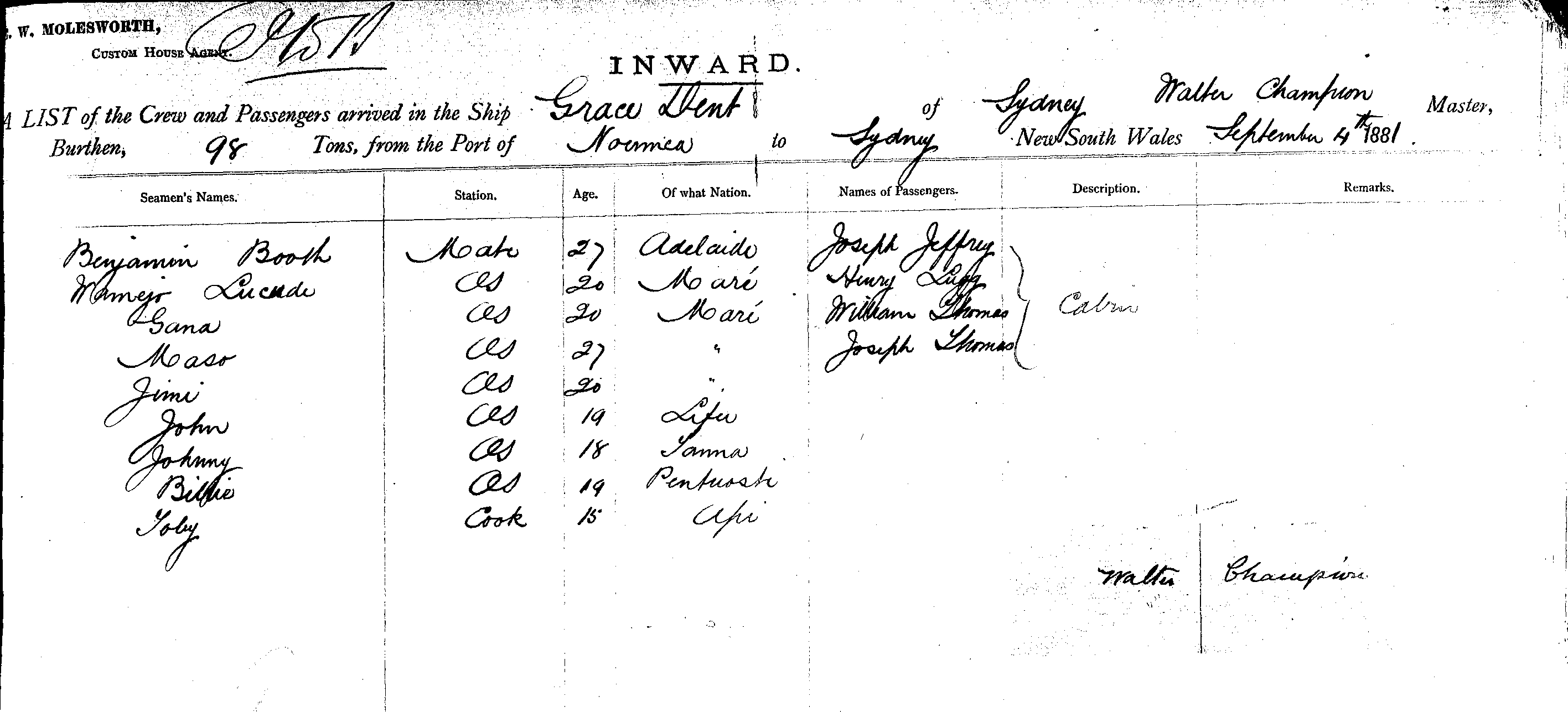 GRACE DENTOF SYDNEY, WALTER CHAMPION MASTER, BURTHEN 98 TONS FROM THE PORT OF NOUMEA TO SYDNEY, NEW SOUTH WALES, SEPTEMBER 4TH 1881 |