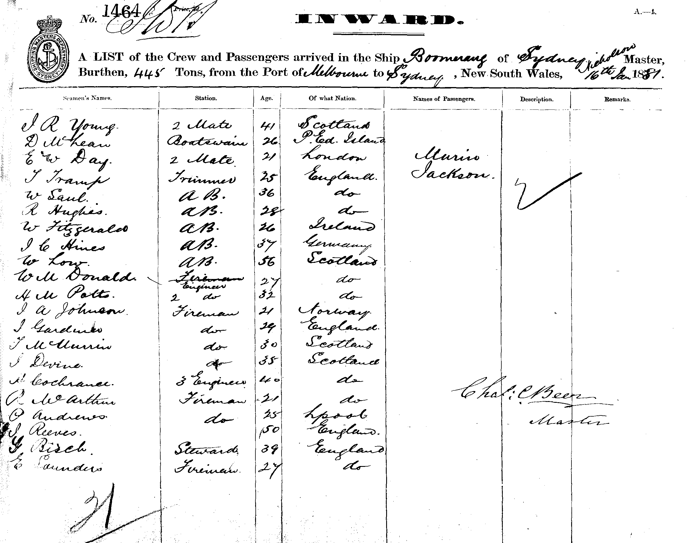 BOOMERANGOF SYDNEY, CHAS C. BEER, MASTER, BURTHEN 445 TONS FROM THE PORT OF MELBOURNE TO SYDNEY, NEW SOUTH WALES, 16TH JANUARY 1881 |