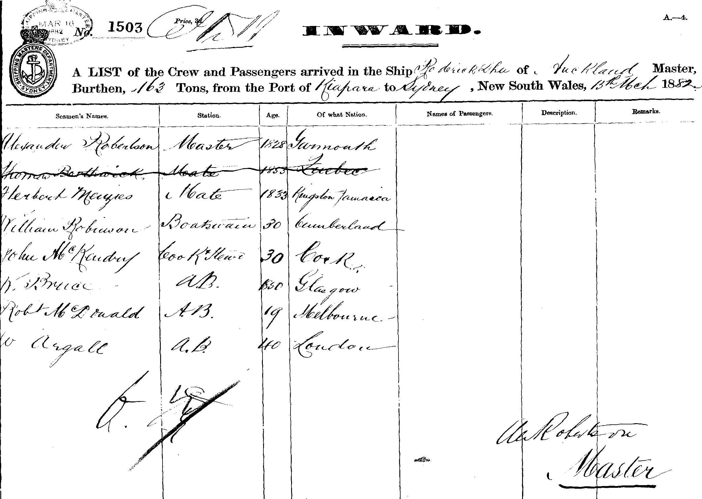 RODERICK DHUOF AUCKLAND, A W ROBERTSON, MASTER, BURTHEN 163 TONS FROM THE PORT OF KIAPARA TO SYDNEY, NEW SOUTH WALES, 13TH MARCH 1882 |