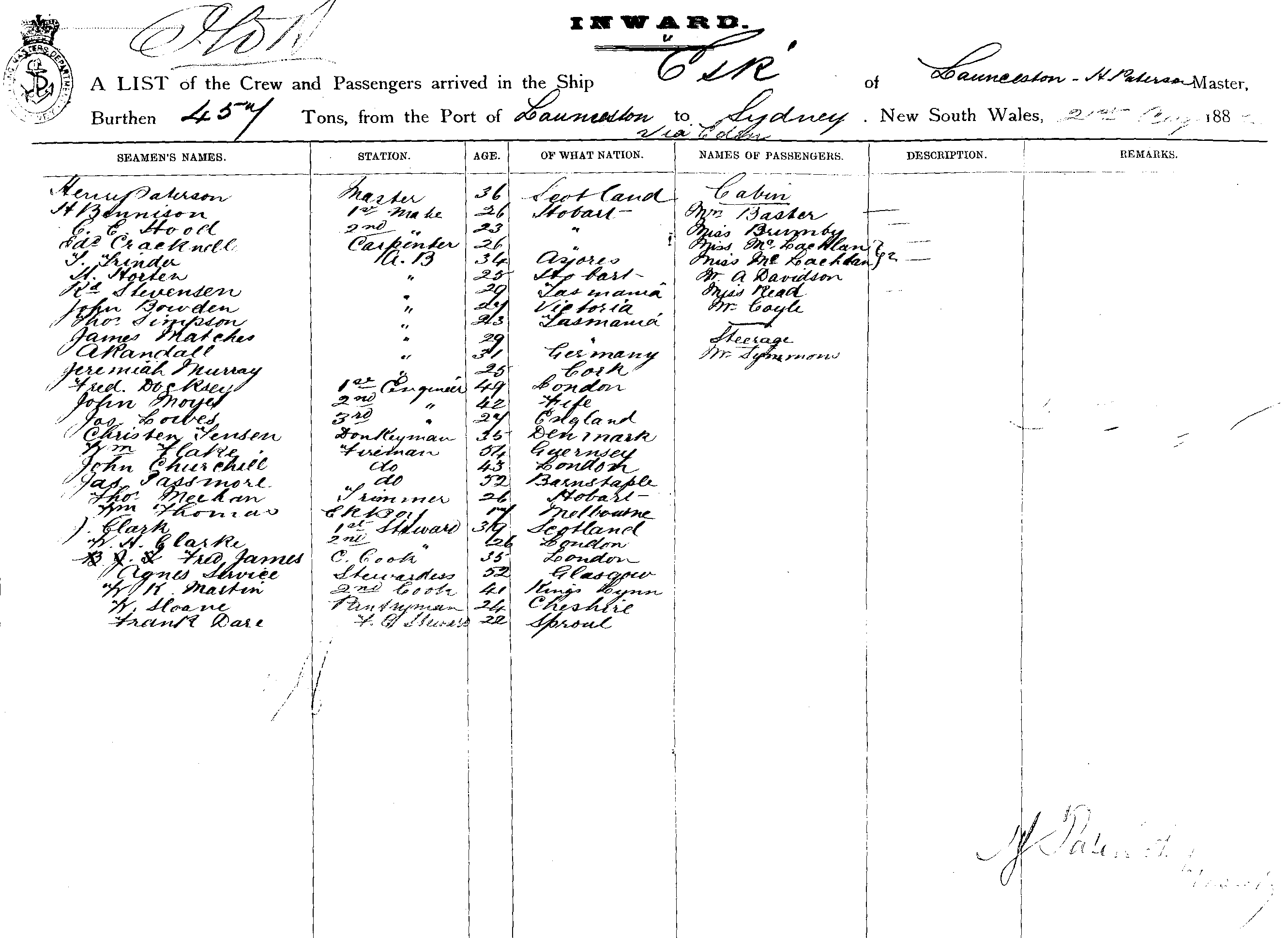 ESKOF LAUNCESTON, HENRY PATERSON, MASTER, BURTHEN 457 TONS FROM THE PORT OF LAUNCESTON via EDEN TO SYDNEY, NEW SOUTH WALES, 21ST AUGUST, 1882 |