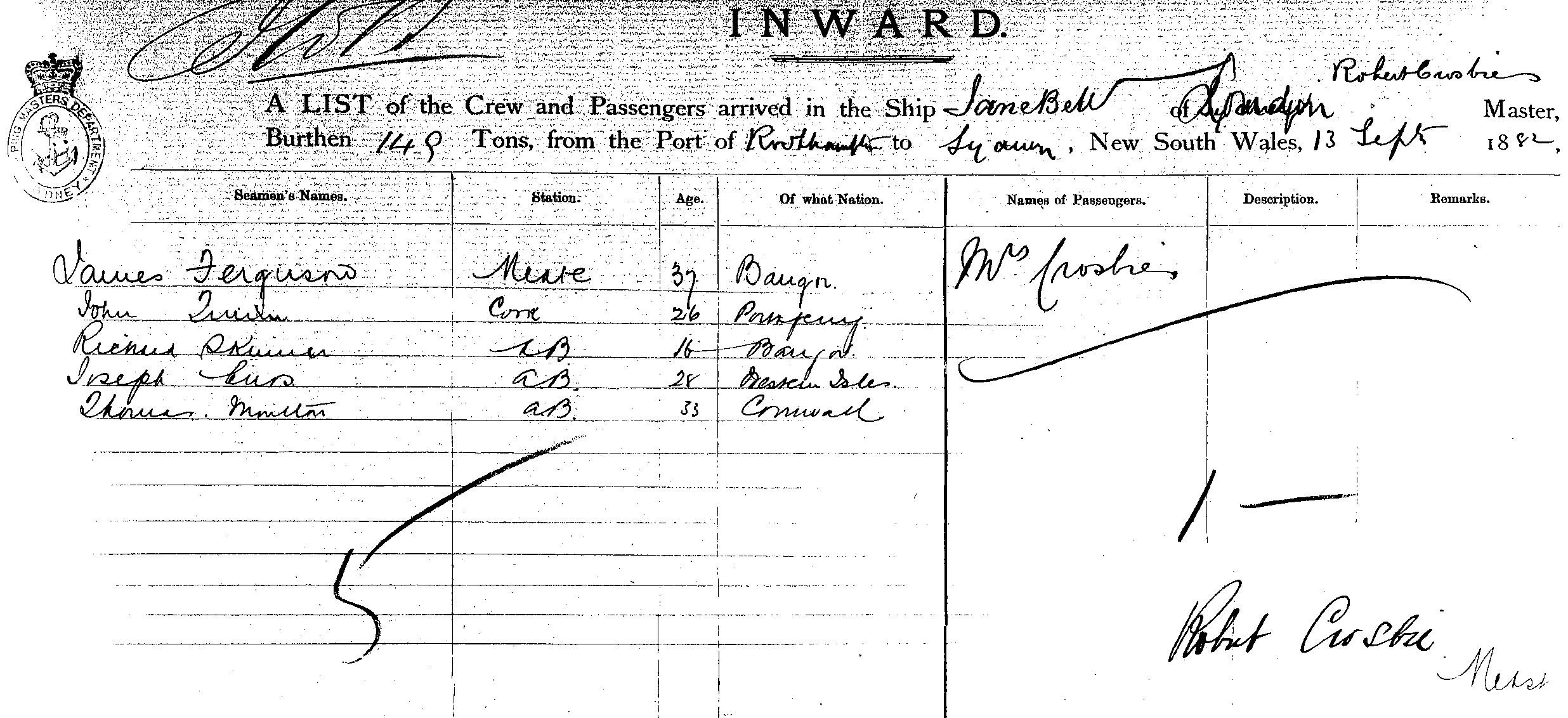 JANE BELLOF LONDON, ROBERT CROSBIE, MASTER, BURTHEN 149 TONS FROM THE PORT OF ROCKHAMPTON TO SYDNEY, NEW SOUTH WALES, 13 SEPT. 1882 |