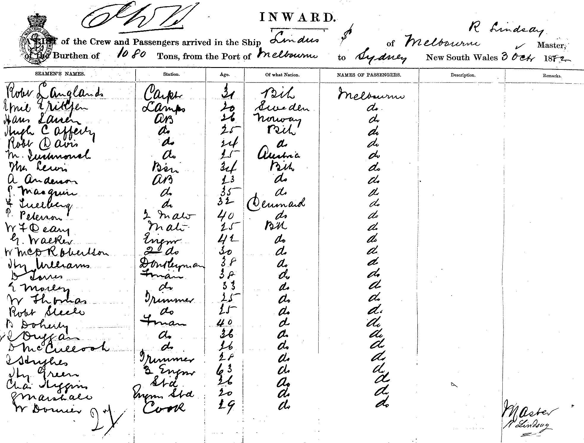 LINDUSOF LONDON, R LINDSAY, MASTER, BURTHEN OF 1080 TONS FROM THE PORT OF MELBOURNE TO SYDNEY, NEW SOUTH WALES, 3 OCTOBER 1882 |