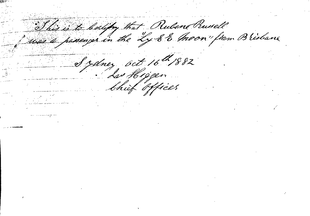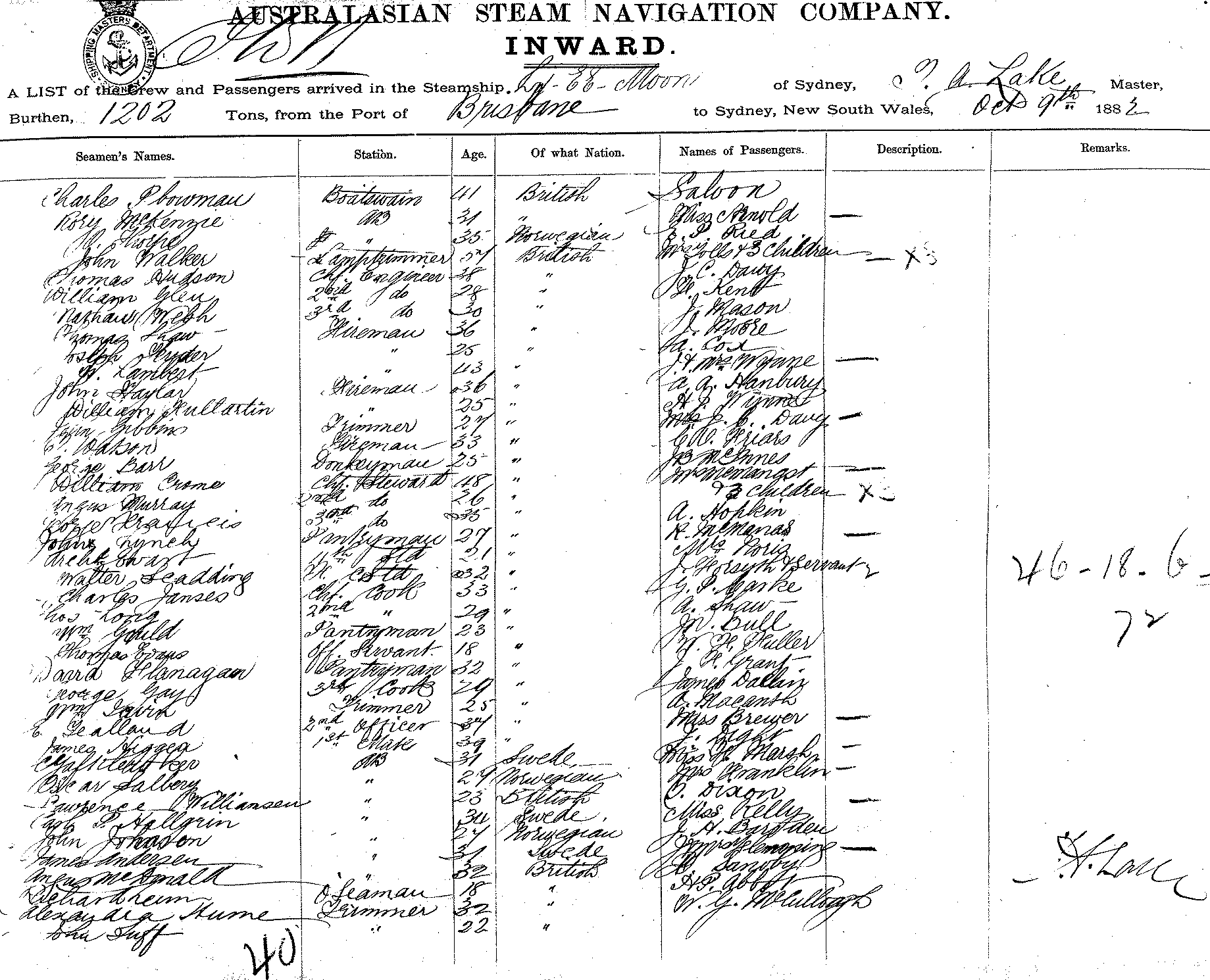 LY-EE MOONOF SYDNEY T A LAKE MASTER BURTHEN 1202 TONS FROM THE PORT OF BRISBANE TO SYDNEY, NEW SOUTH WALES, 9 OCT 1882 |