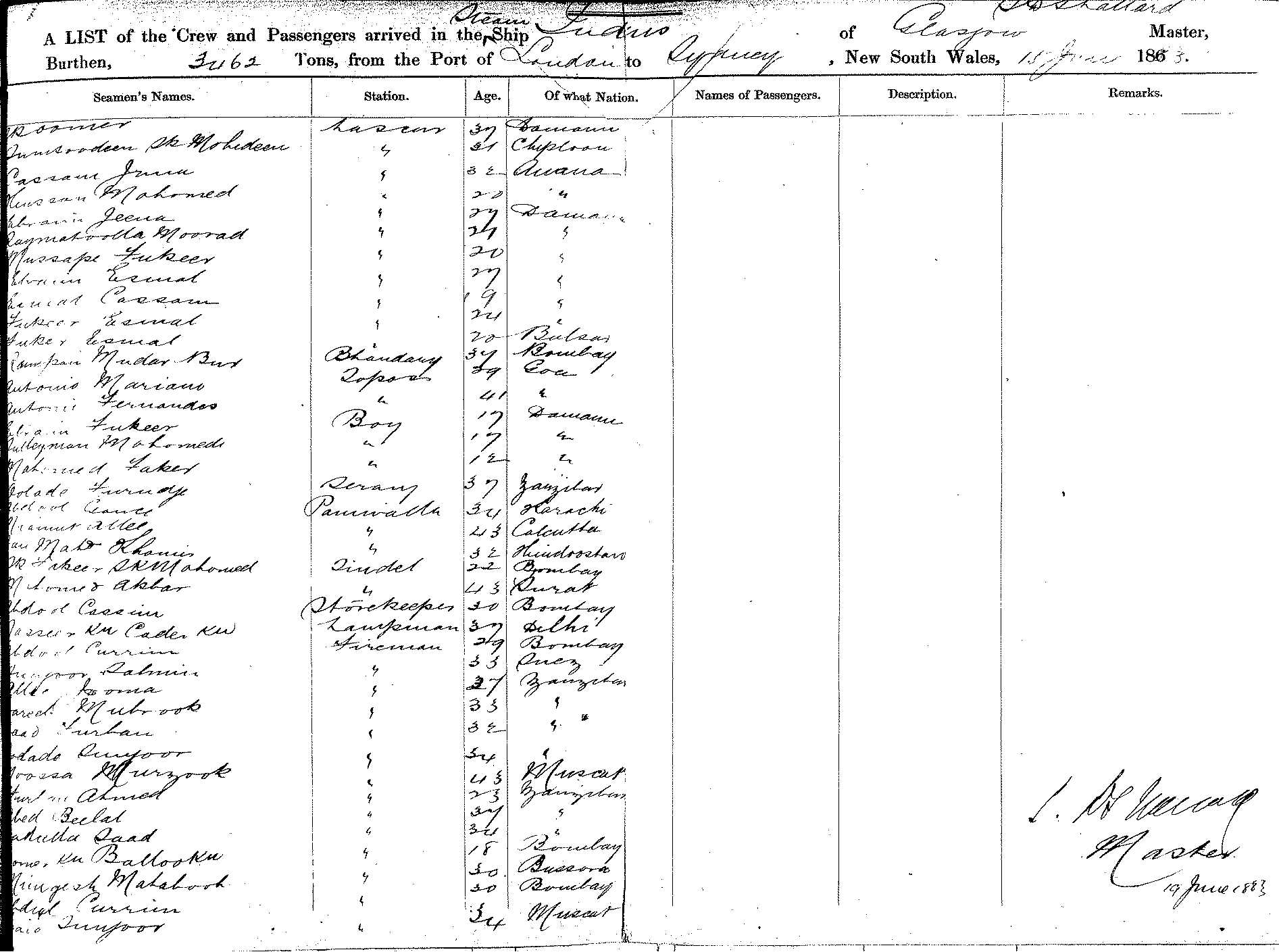 INDUSSTEAMSHIP OF GLAGOW, P. D SHALLARD, MASTER, BURTHEN 3462 TONS FROM THE PORT OF LONDON TO SYDNEY, NEW SOUTH WALES, 16 JUNE 1883 |