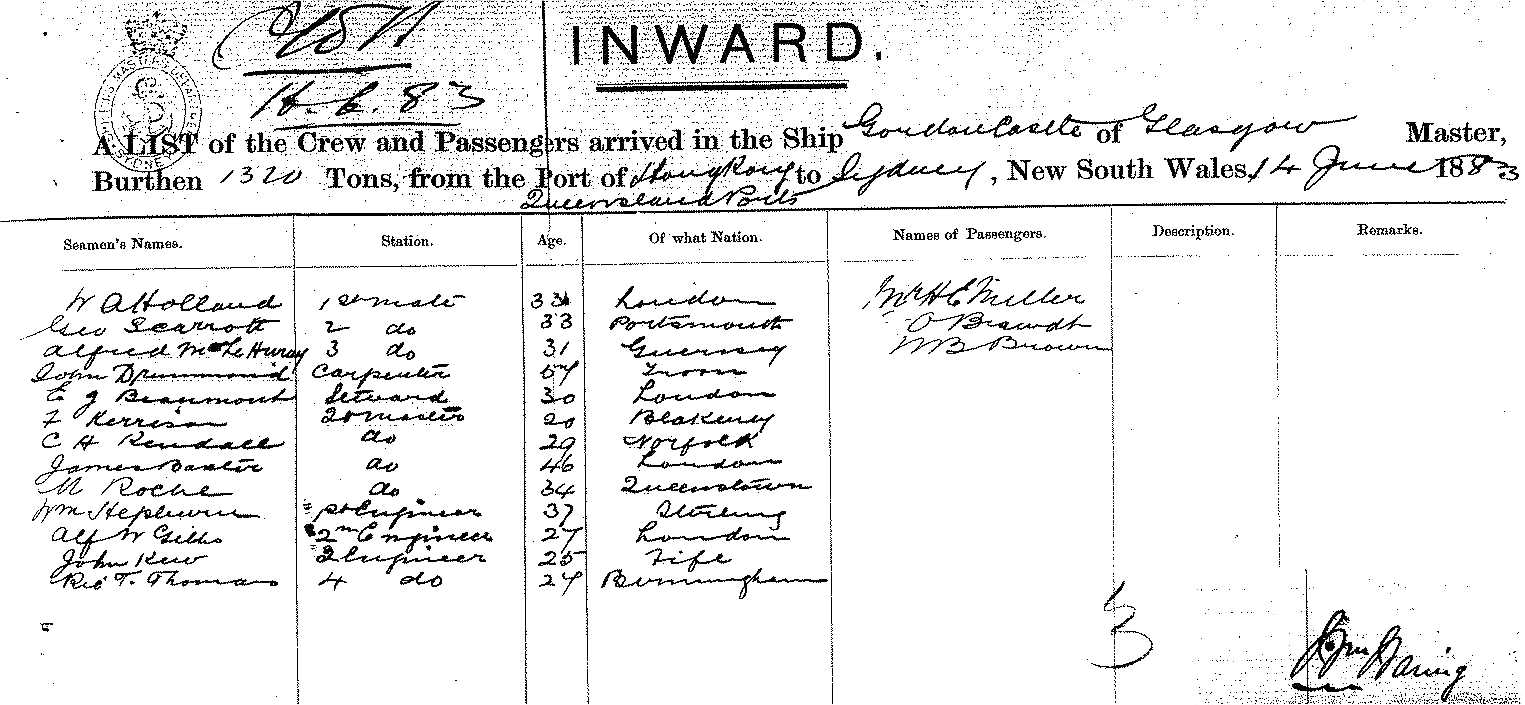 GORDON CASTLEOF GLAGOW, W. WARING, MASTER, BURTHEN 1320 TONS FROM THE PORT OF HONG KONG & QUEENSLAND PORTS TO SYDNEY, NEW SOUTH WALES, 14JJUNE, 1883 |