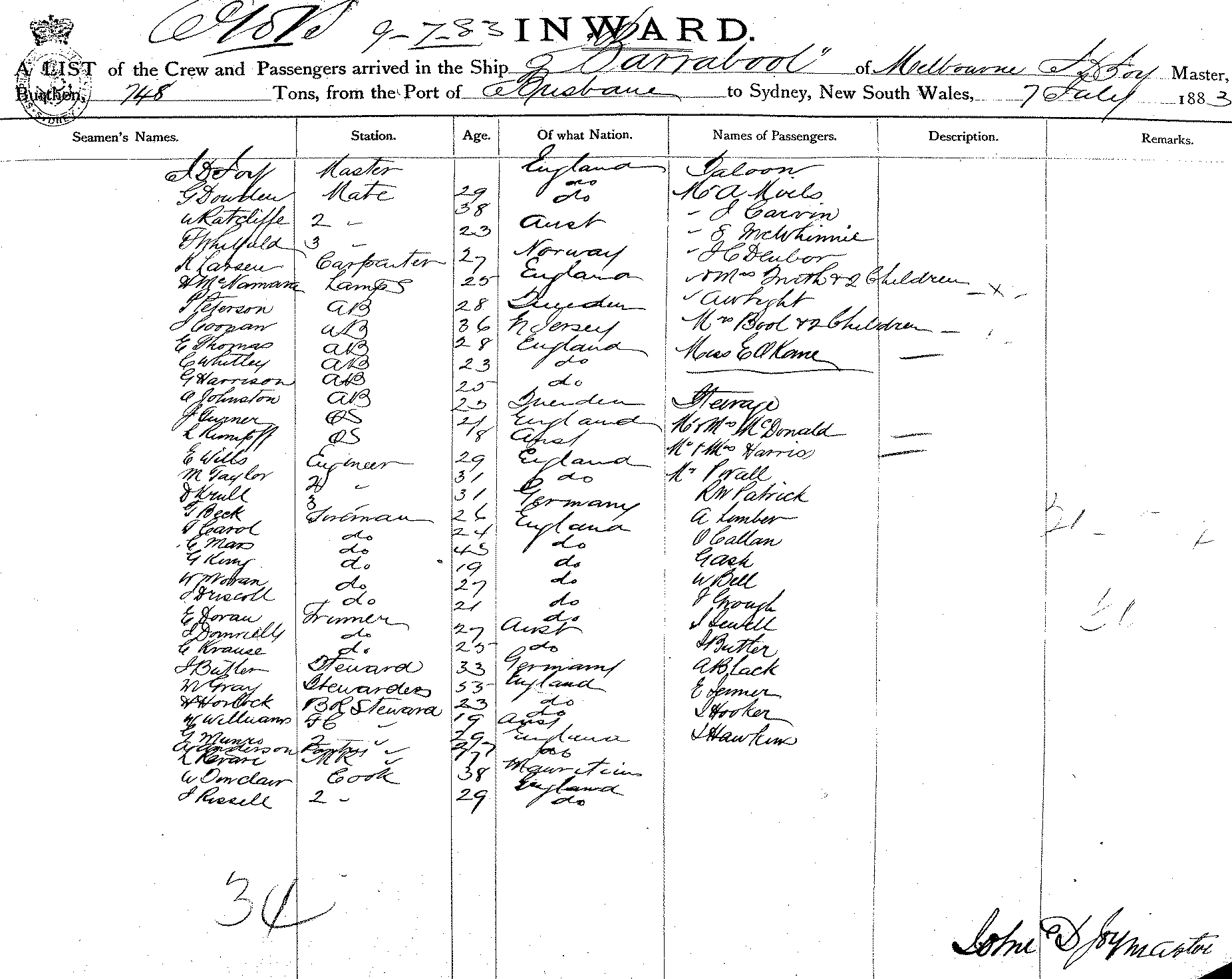 BARRABOOLOF MELBOURNE J D FOY MASTER BURTHEN 748 TONS FROM THE PORT OF BRISBANE TO SYDNEY, NEW SOUTH WALES, 7 JULY 1883 |