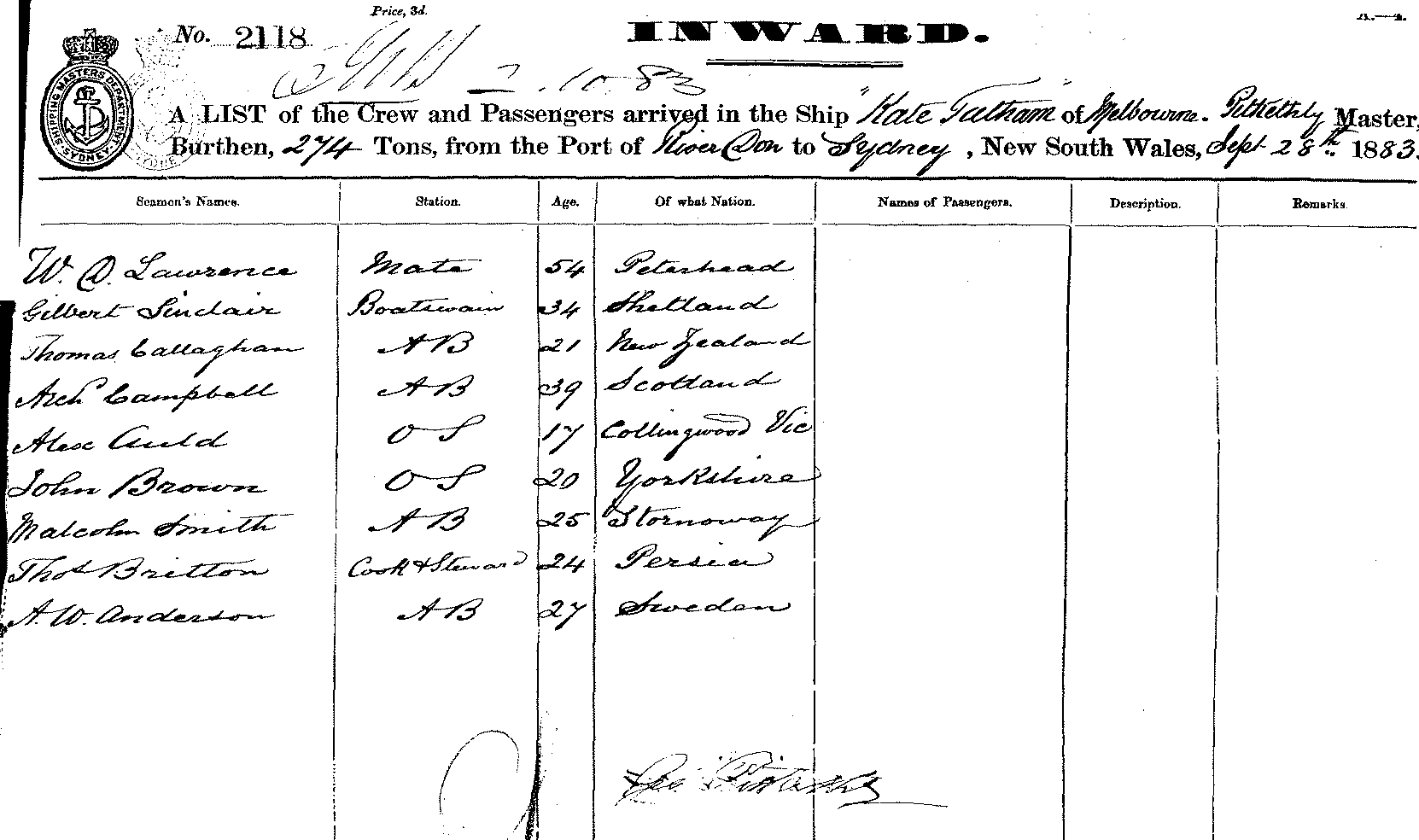 KATE TATHAMOF MELBOURNE, GEO. PITKETHLY, MASTER, BURTHEN 274 TONS FROM THE PORT OF RIVER DON TO SYDNEY, NEW SOUTH WALES, SEPT 28TH 1883 |