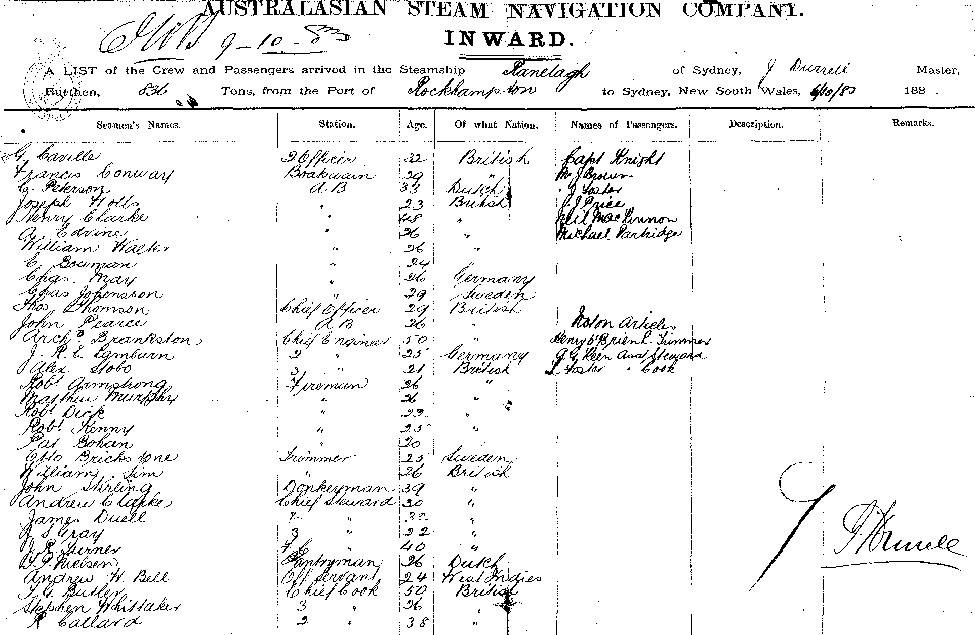 RANELAGHOF SYDNEY, J. DURRELL, MASTER, BURTHEN 836 TONS FROM THE PORT OF ROCKHAMPTON TO SYDNEY, NEW SOUTH WALES, 6TH OCTOBER 1883 |