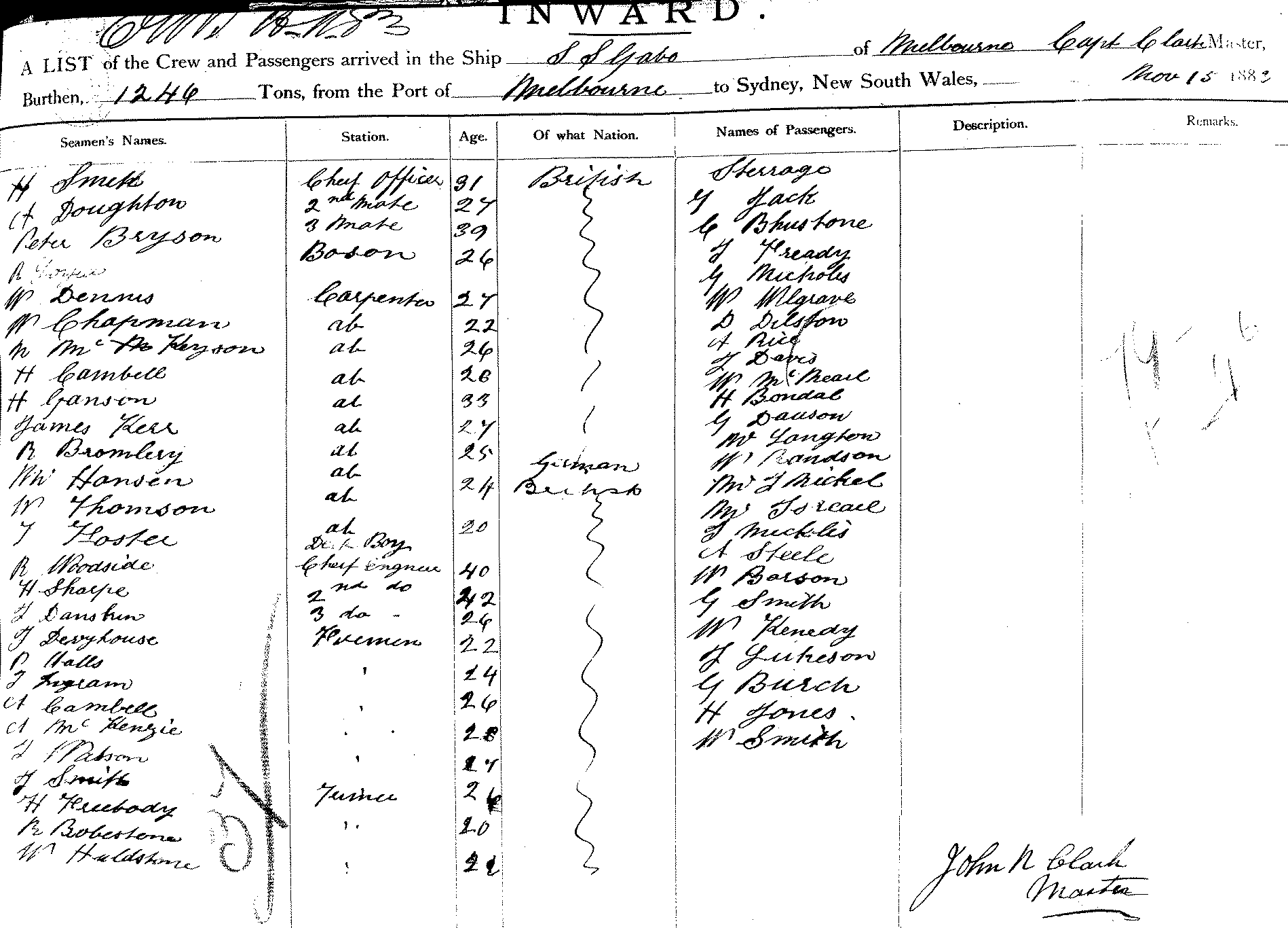 GABOOF MELBOURNE, JOHN N. CLARK, MASTER, BURTHEN 1246 TONS FROM THE PORT OF MELBOURNE TO SYDNEY, NEW SOUTH WALES, 15TH NOVEMBER 1883 |