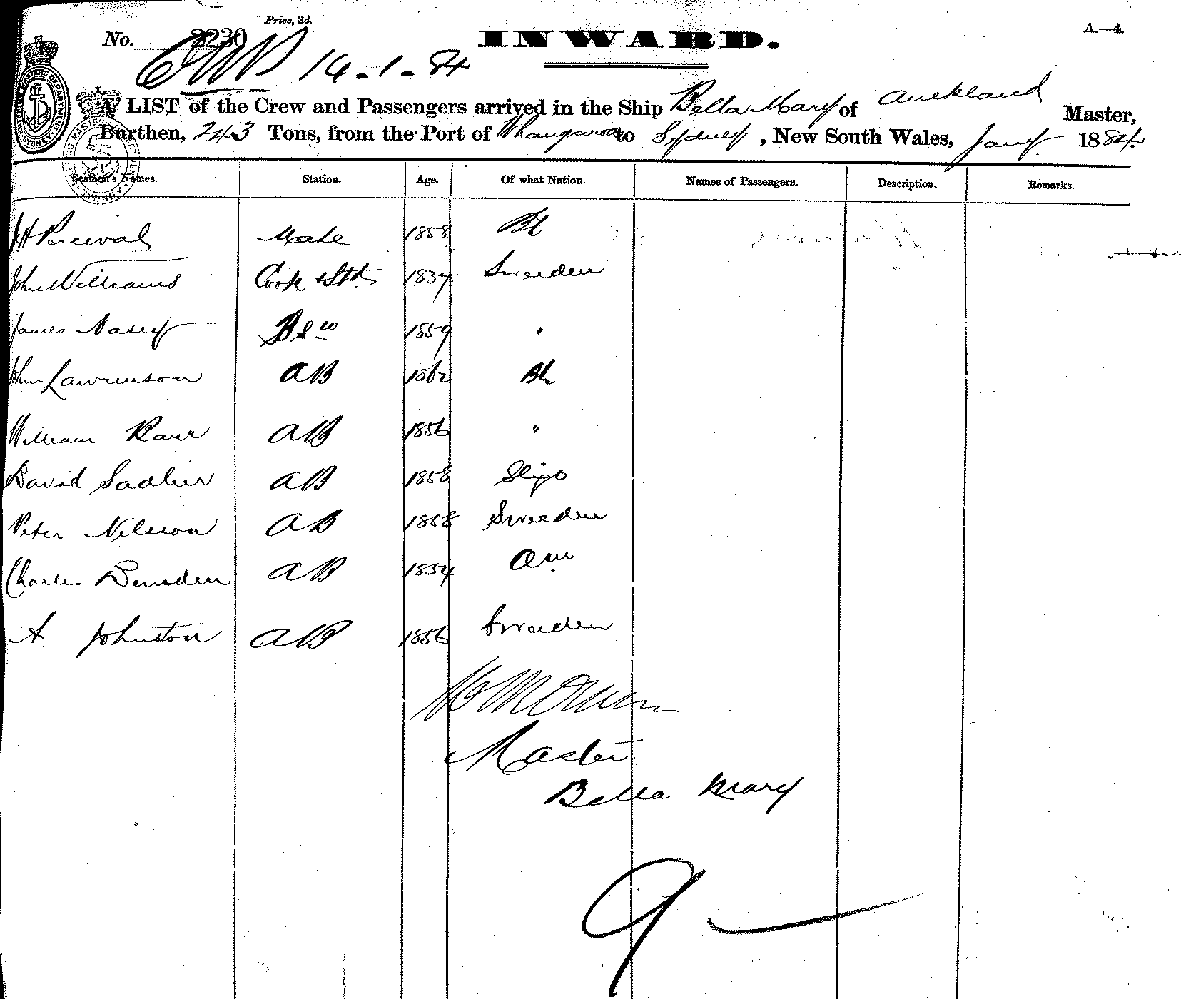 BELLA MARYOF AUCKLAND, M. OWEN ?, MASTER, BURTHEN 243 TONS FROM THE PORT OF WHANGANUI TO SYDNEY, NEW SOUTH WALES, JANUARY, 1884 |