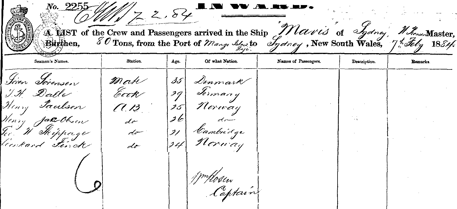 MAVISOF SYDNEY, WM HOSEN, MASTER, BURTHEN 80 TONS FROM THE PORT OF MANGO ISLANDS/FIJI TO SYDNEY, NEW SOUTH WALES, 7 FEBRUARY, 1884 |