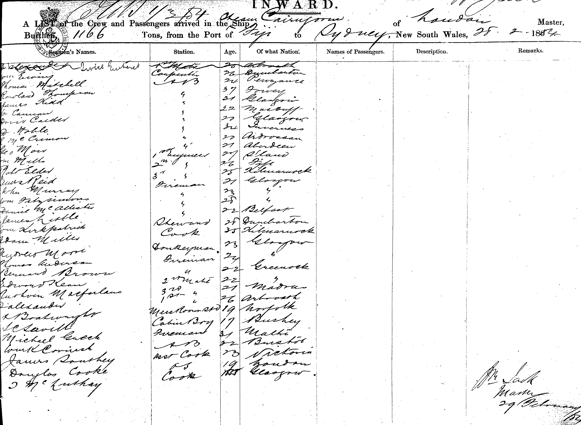 CAIRNIFORINOF HOUDAIN, WM. LACK, MASTER, BURTHEN 1166 TONS FROM THE PORT OF FIJI TO SYDNEY, NEW SOUTH WALES, 28 FEB 1884 |