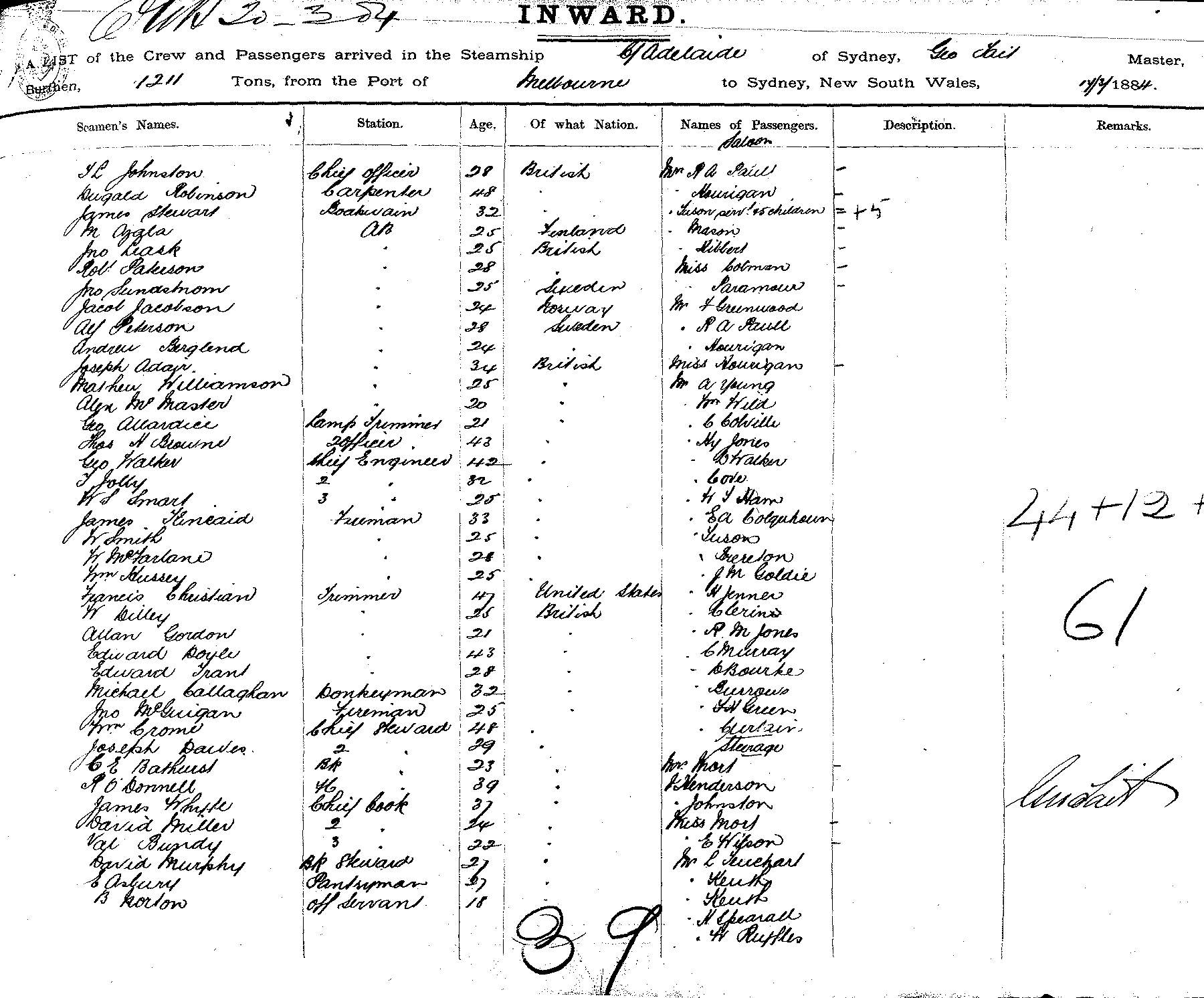 CITY OF ADELAIDESTEAMSHIP OF SYDNEY, TAIT MASTER, BURTHEN 1211 TONS, FROM THE PORT OF MELBOURNE TO SYDNEY, NEW SOUTH WALES, 17TH MARCH 1884 |
