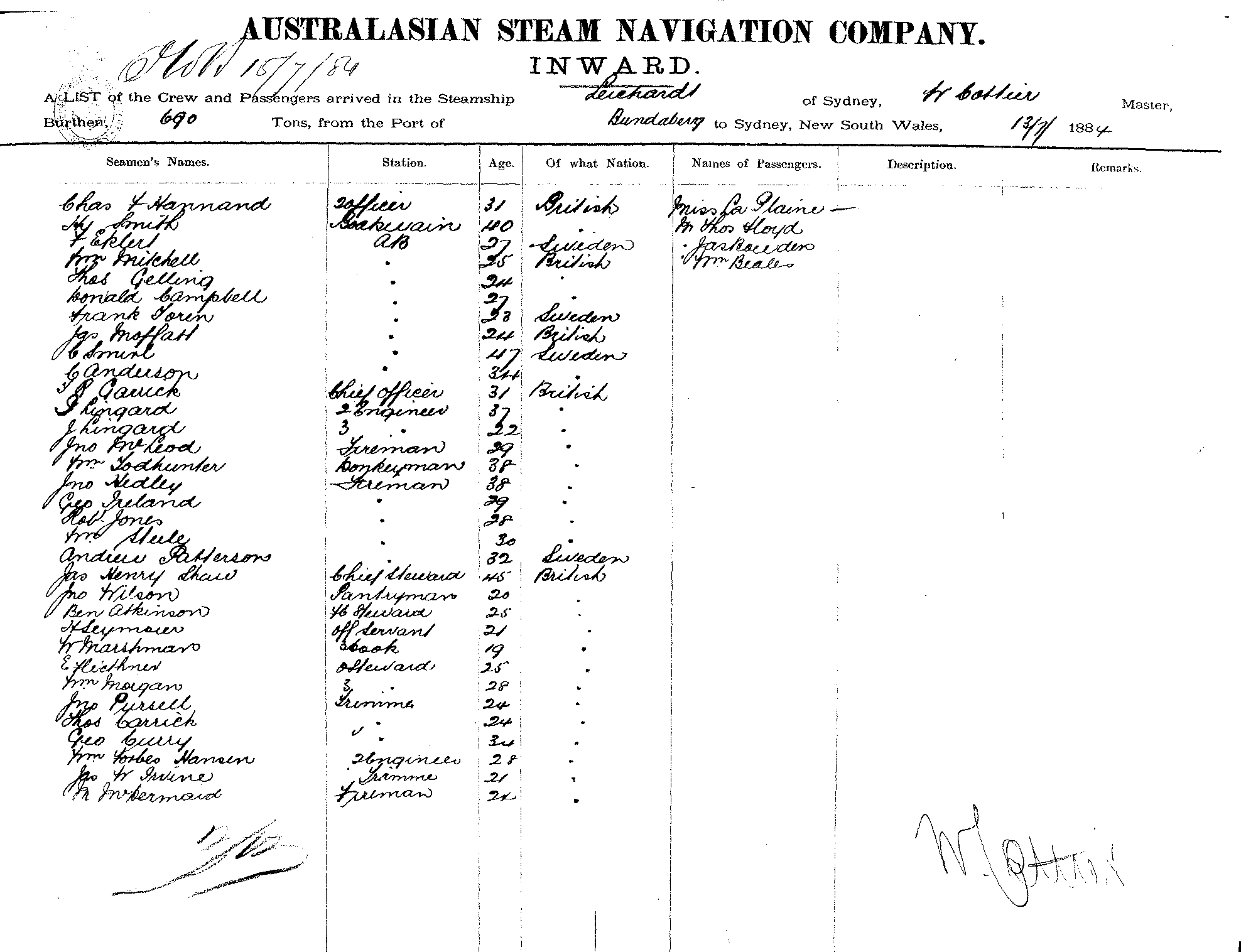 Source: State Records Authority of New South Wales: Shipping Master's Office; Passengers Arriving 1855 - 1922; NRS13278, [X168] reel 462. Transcribed by Tamea Willcocks. You may view/print a scan of the original list - a monitor set to high resolution is recommended for clarity. Use your back button to return. |