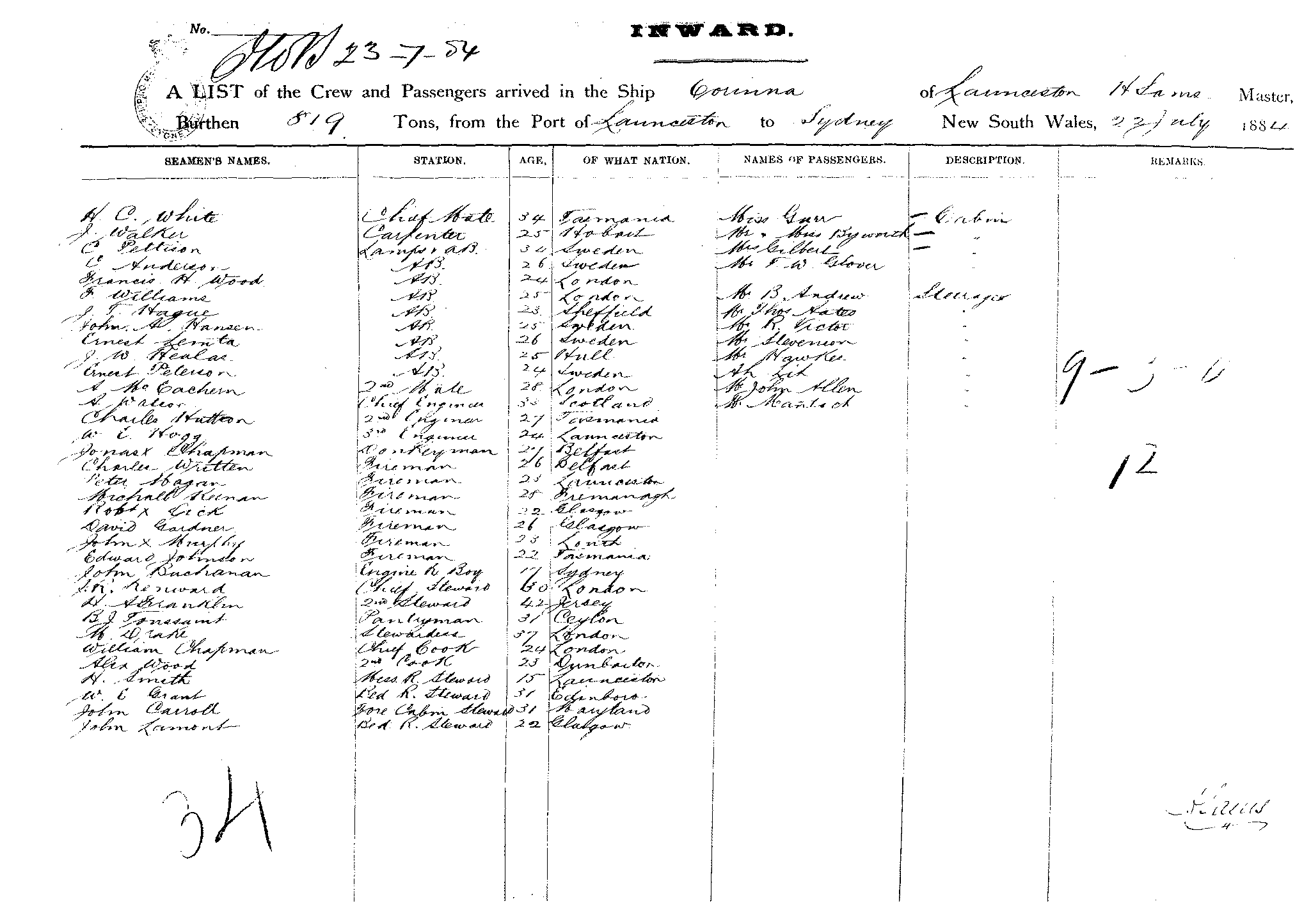 CORINNA OF LAUNCESTON, H. SAMS, MASTER, BURTHEN 1260 TONS FROM THE PORT OF LAUNCESTON TO SYDNEY, NEW SOUTH WALES, 22ND JULY 1884 |