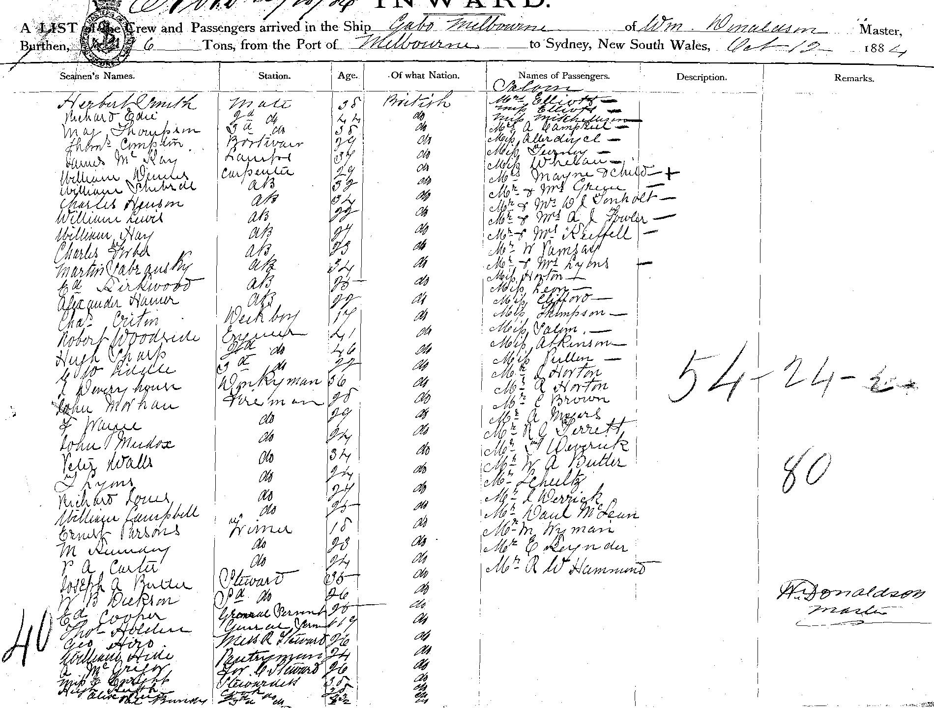 GABOOF MELBOURNE, WM DONALDSON, MASTER, BURTHEN 1296 TONS FROM THE PORT OF MELBOURNE TO SYDNEY, NEW SOUTH WALES, 12 OCT 1884 |