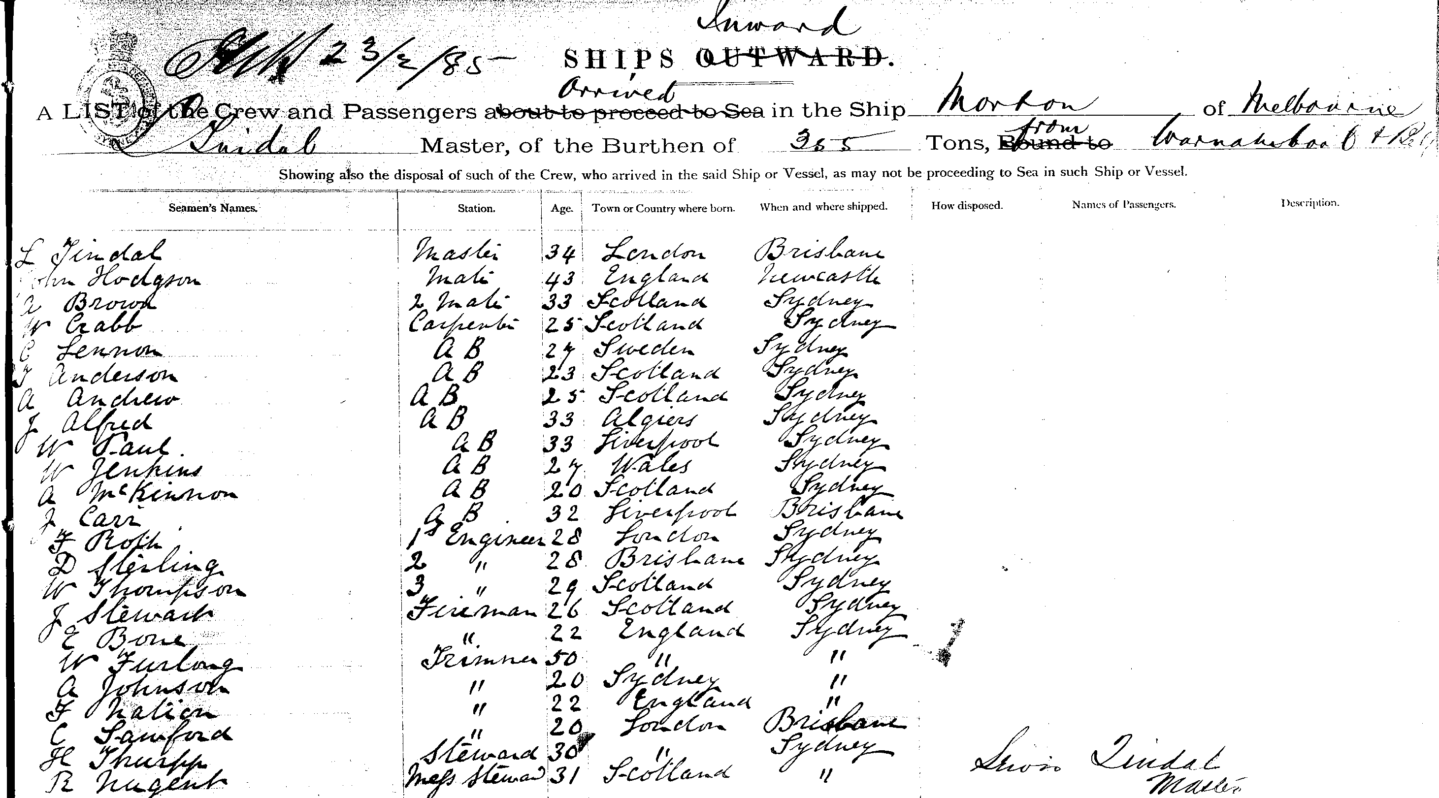 MORTONOF MELBOURNE, LEWIS TINDAL, MASTER, BURTHEN 355 TONS, FROM THE PORT OF WARRNAMBOOL & RE ? TO SYDNEY, NEW SOUTH WALES, 23RD FEBRUARY 1885