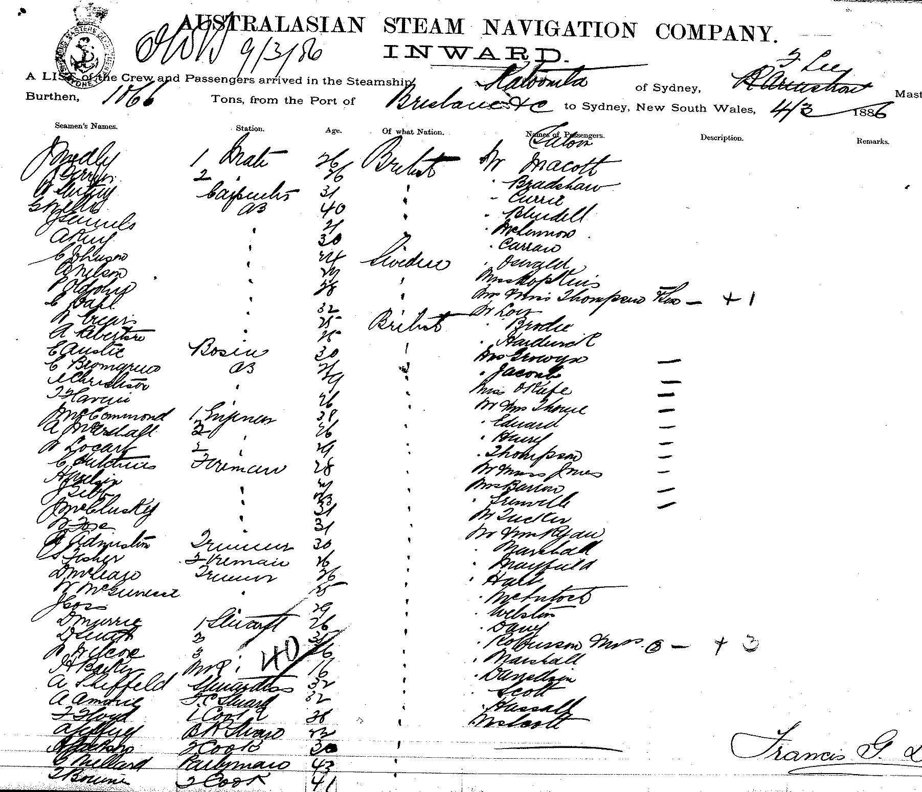 KATOOMBAOF SYDNEY, FRANCIS G LEE, MASTER, BURTHEN 1066 TONS FROM THE PORT OF BRISBANE & C TO SYDNEY, NEW SOUTH WALES, 4TH MARCH 1886 |
