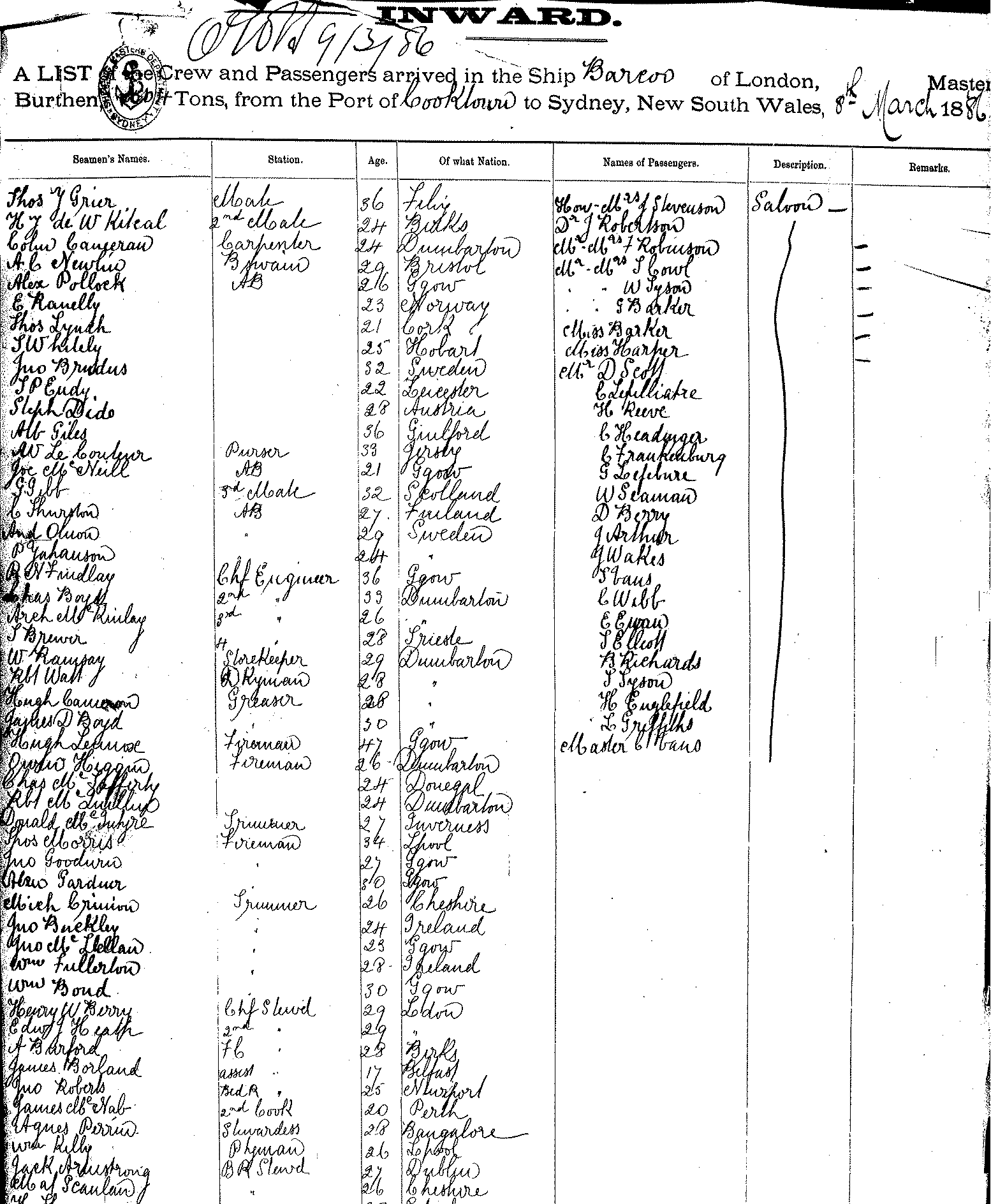 Source: State Records Authority of New South Wales: Shipping Master's Office; Passengers Arriving 1855 - 1922; NRS13278, [X180] reel 472. Transcribed by Bob Manning. Names proofread by Society of Australian Genealogists. You may view/print a scan of the original list - a monitor set to high resolution is recommended for clarity. Use your back button to return. |
