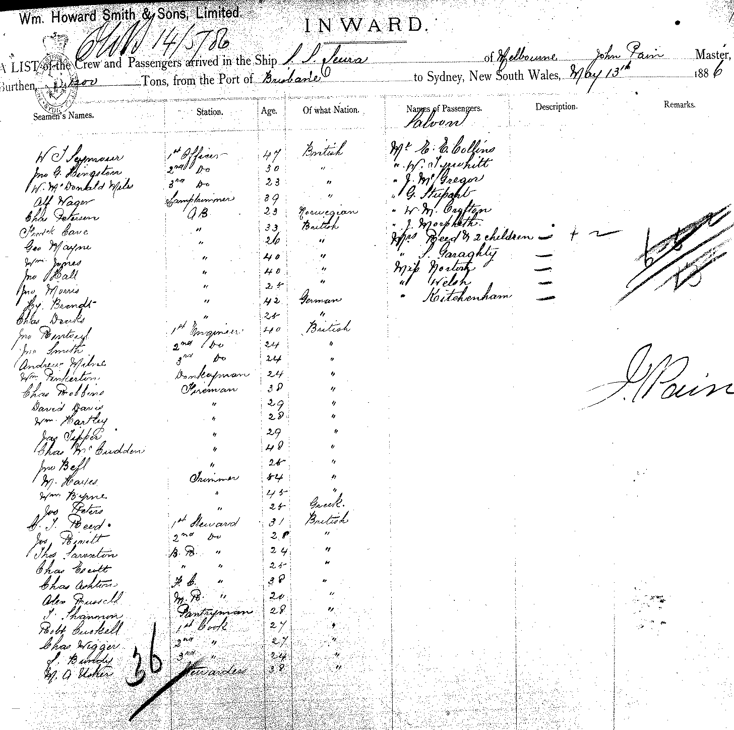 LEURAOF MELBOURNE, JOHN PAIN, MASTER, BURTHEN 1200 TONS FROM THE PORT OF BRISBANE TO SYDNEY, NEW SOUTH WALES, MAY, 1886 |