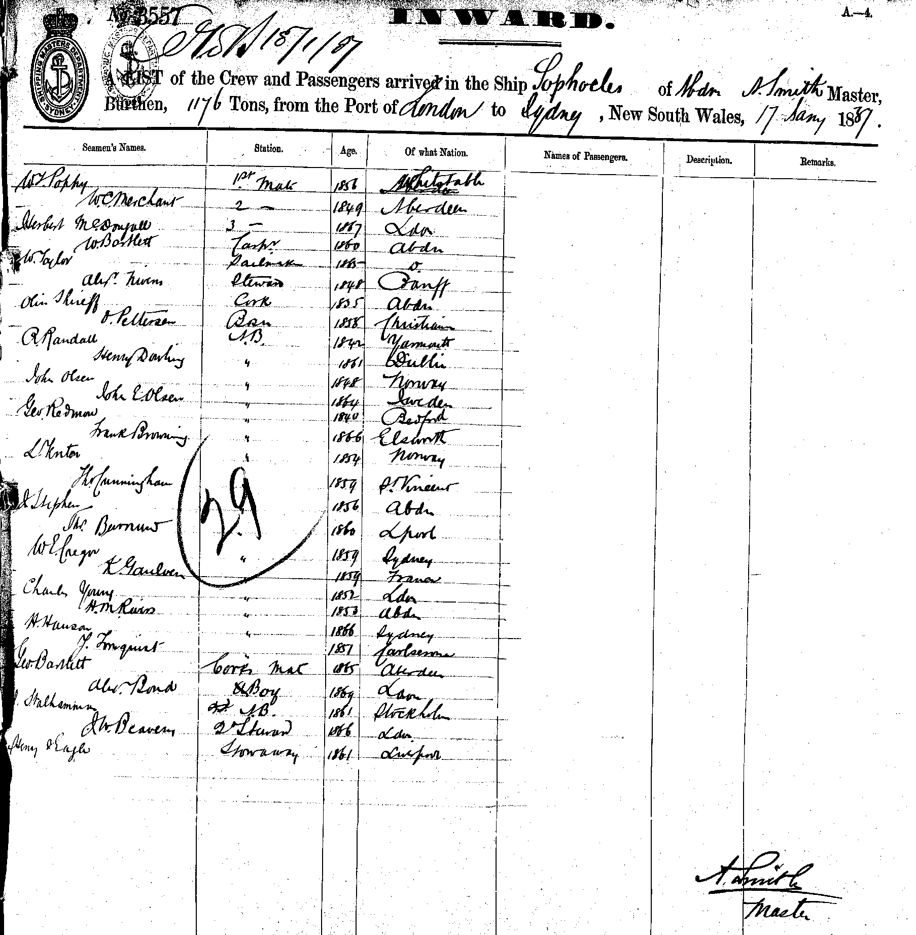SOPHOCLESOF ABDN, A. SMITH, MASTER, BURTHEN 1176 TONS FROM THE PORT OF LONDON TO SYDNEY, NEW SOUTH WALES, 17 JANY 1887 |