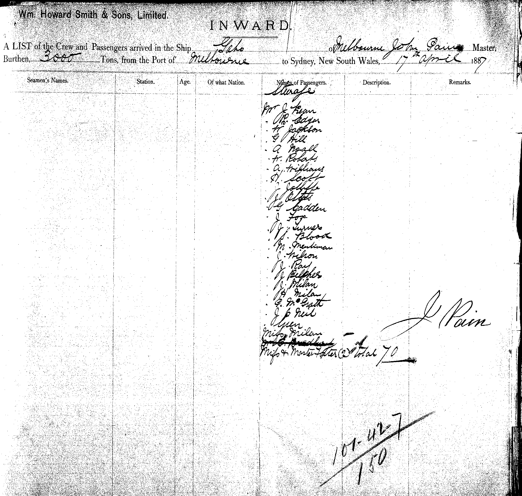 GABOOF MELBOURNE, JOHN PAIN, MASTER, BURTHEN 3000 TONS. FROM MELBOURNE TO SYDNEY, NEW SOUTH WALES, 17TH APRIL 1887 |