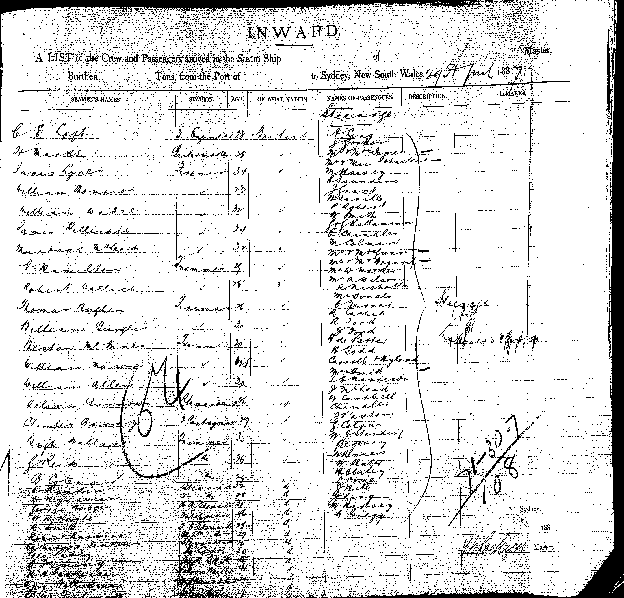 Source: State Records Authority of New South Wales: Shipping Master's Office; Passengers Arriving 1855 - 1922; NRS13278, [X186], reel 478. Transcribed by Ed Simpson. Names proofread by Society of Australian Genealogists. You may view/print a scan of the original list - a monitor set to high resolution is recommended for clarity. Use your back button to return. |