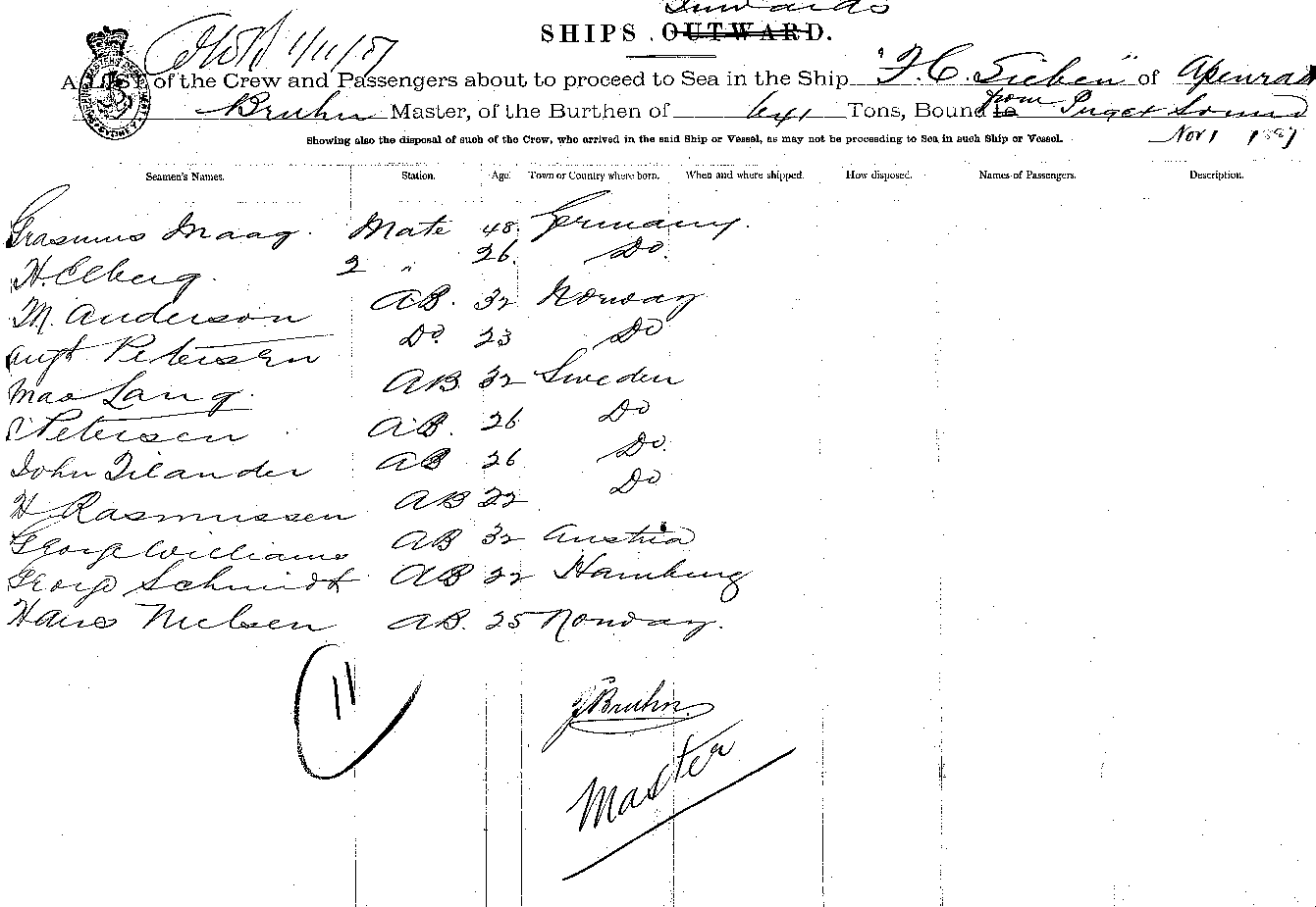 F C SIEBENOF APEURA, J. BRUHN, MASTER, BURTHEN 641 TONS FROM THE PORT OF PUGET SOUND TO SYDNEY, NEW SOUTH WALES, 1ST NOVEMBER, 1887 |