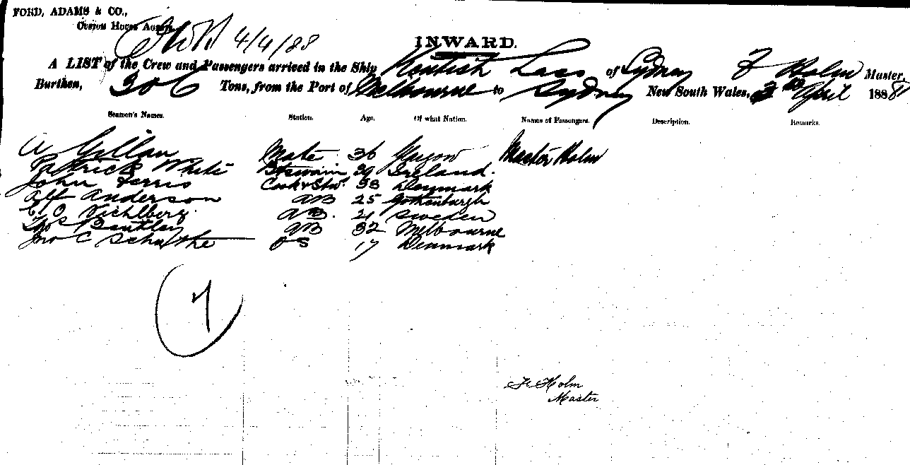 KENTISH LASSOF SYDNEY, F. HOLM, MASTER, BURTHEN 814 TONS FROM THE PORT OF MELBOURNE TO SYDNEY, NEW SOUTH WALES, 3RD APRIL 1888 |