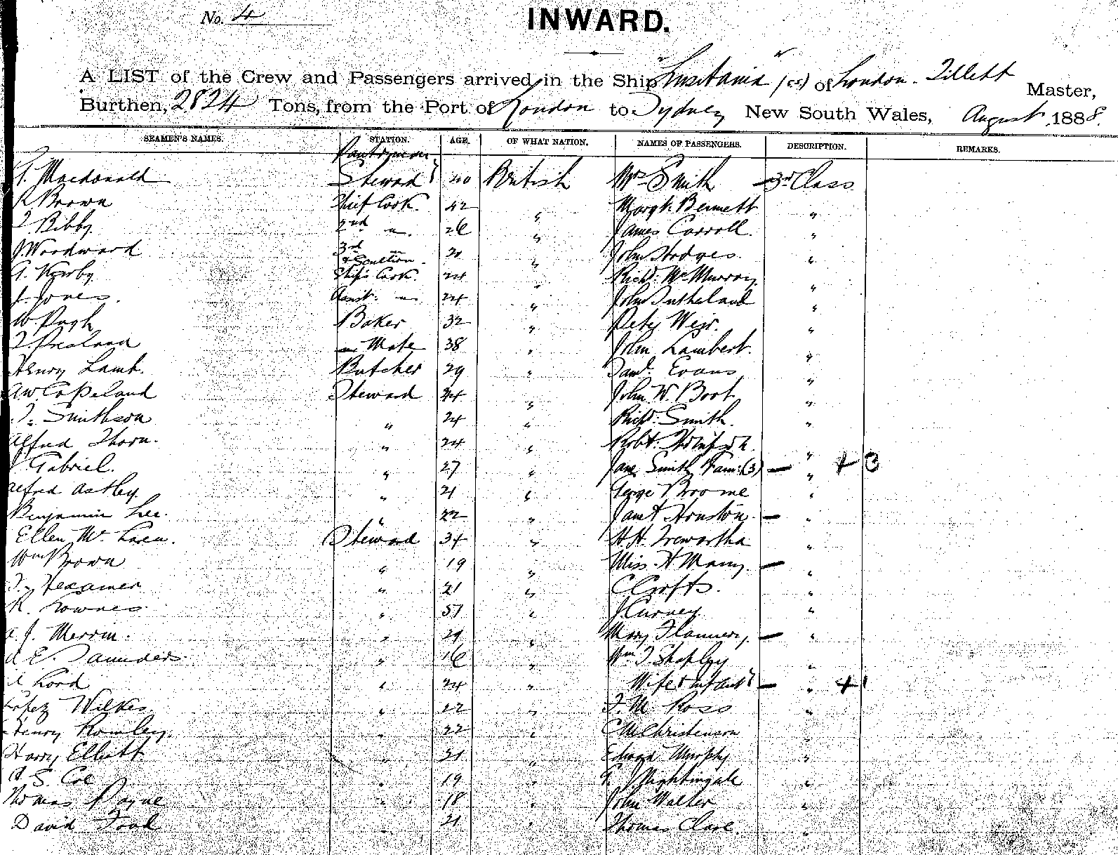 LUSITANIAOF LONDON, A. TILLETT, MASTER, BURTHEN 2824 TONS FROM THE PORT OF LONDON TO SYDNEY, NEW SOUTH WALES, AUGUST, 1888 |