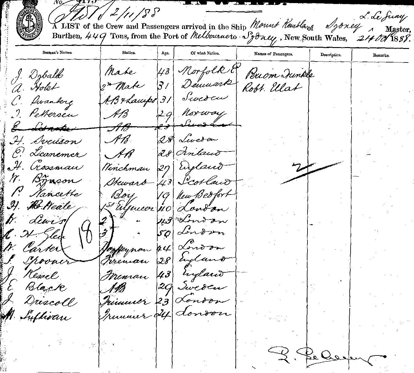MOUNT KEMBLAOF SYDNEY, L LE GUAY, MASTER, BURTHEN 449 TONS FROM THE PORT OF MELBOURNE TO SYDNEY, NEW SOUTH WALES, 24TH OCTOBER 1888 |
