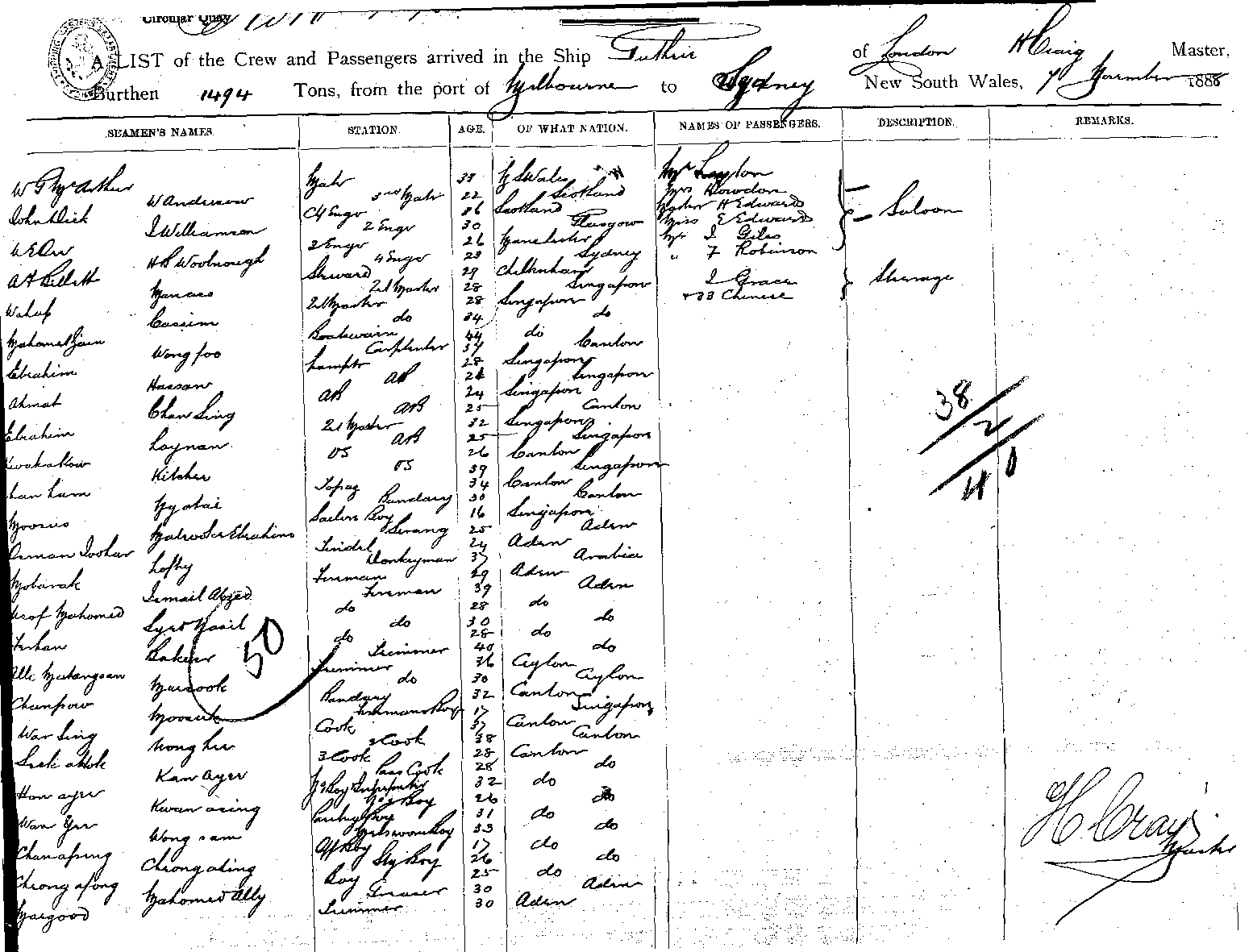 Source: State Records Authority of New South Wales: Shipping Master's Office; Passengers Arriving 1855 - 1922; NRS13278, [X195-X196] reel 488. Transcribed by Jack Batchler. You may view/print a scan of the original list - a monitor set to high resolution is recommended for clarity. Use your back button to return. |