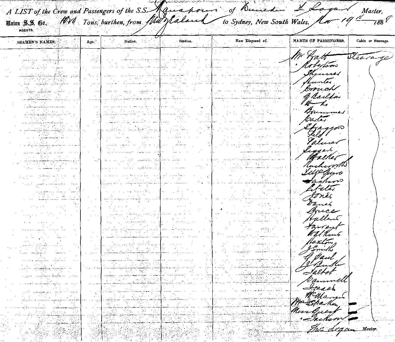 MANAPOURIOF DUNEDIN, THOMAS LOGAN, MASTER, BURTHEN 1020 TONS FROM THE PORT OF NEW ZEALAND PORTS TO SYDNEY NEW SOUTH WALES, 19 NOVEMBER 1888 |