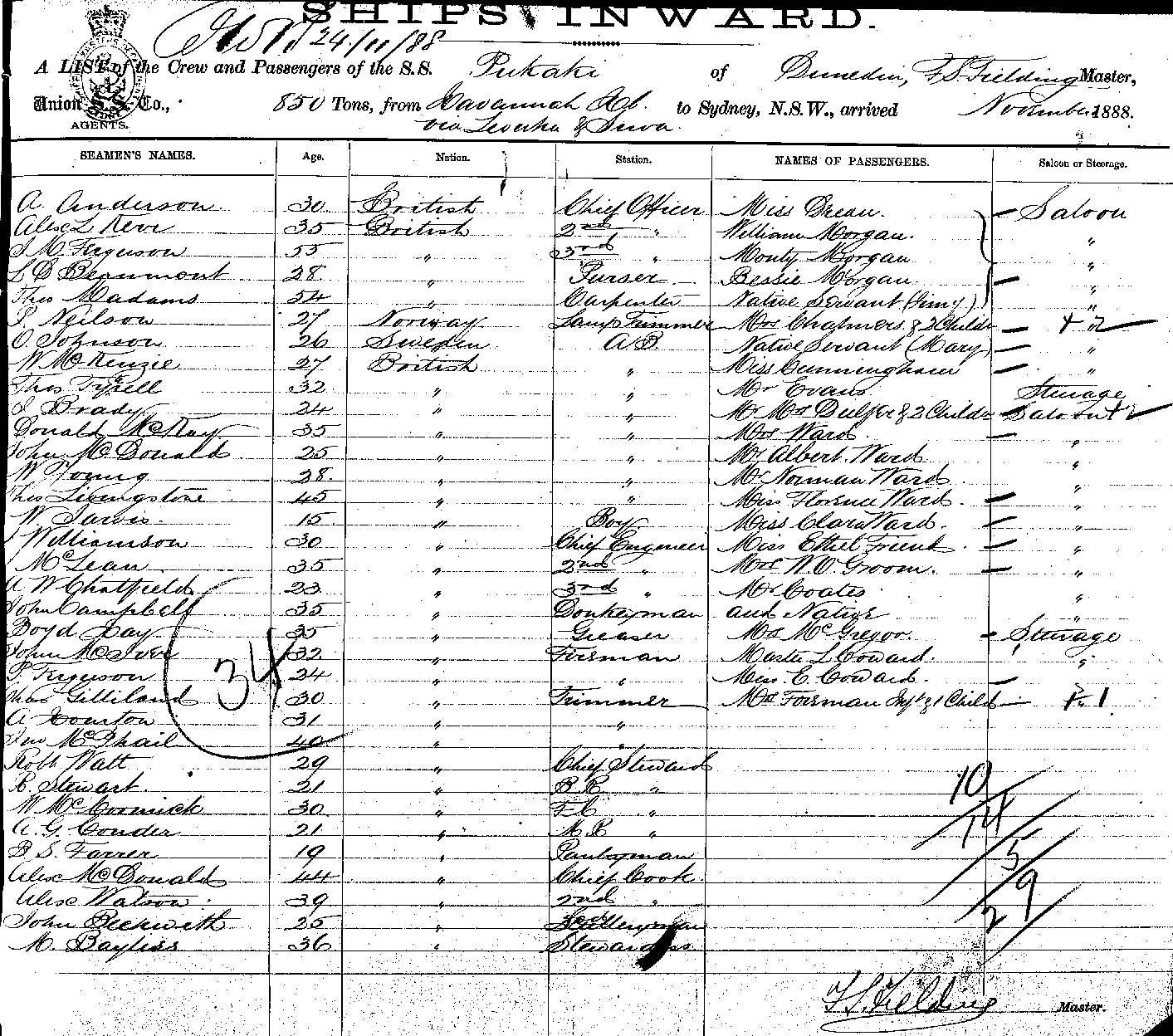 PUKAKIOF DUNEDIN, F S FIELDING, MASTER, BURTHEN 850 TONS FROM THE PORT OF HAVANNAH ISLAND, VIA LEVUKA & SUVA TO SYDNEY NEW SOUTH WALES, NOVEMBER 1888 |