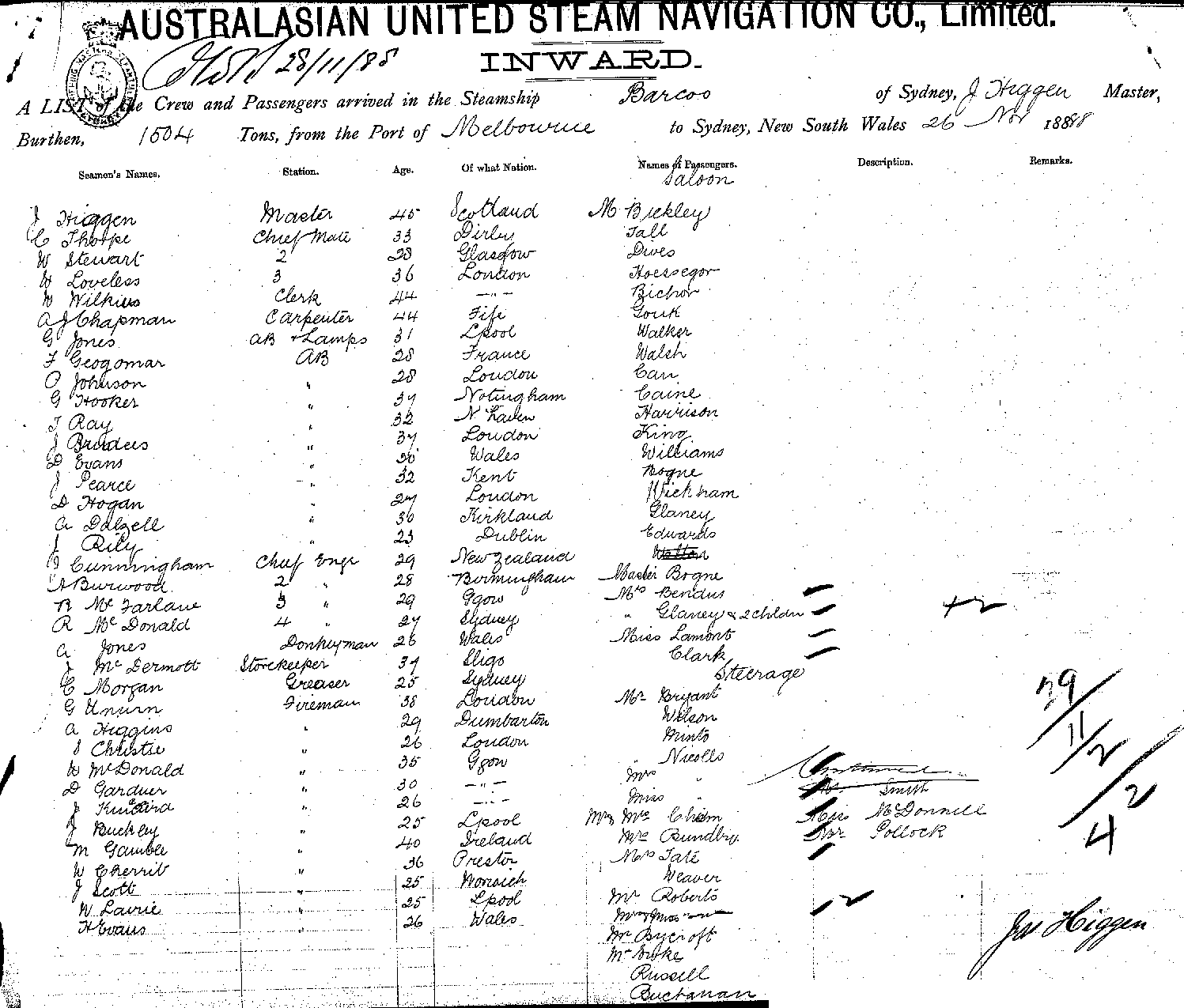 BARCOOOF SYDNEY, JAS HIGGEN, MASTER, BURTHEN 1504 TONS FROM THE PORT OF MELBOURNE TO SYDNEY NEW SOUTH WALES, 26 NOVEMBER 1888 |