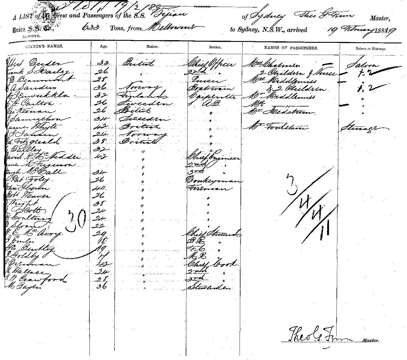 FIJIANSTEAMSHIP OF SYDNEY, THEO G. FENN, MASTER, BURTHEN 633 TONS FROM THE PORT OF MELBOURNE TO SYDNEY, NEW SOUTH WALES, 19TH FEBRUARY, 1889 |