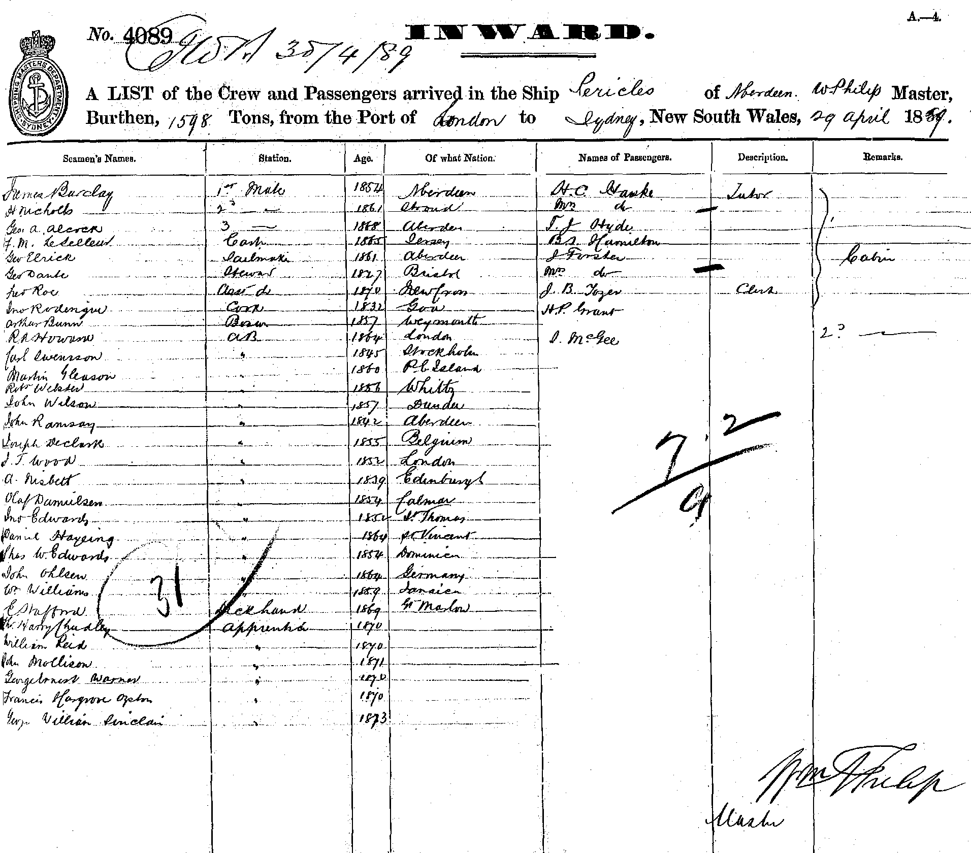 PERICLESOF ABERDEEN, WILLIAM PHILIP, MASTER, BURTHEN 1598 TONS FROM THE PORT OF LONDON TO SYDNEY, NEW SOUTH WALES, 29TH APRIL, 1889 |