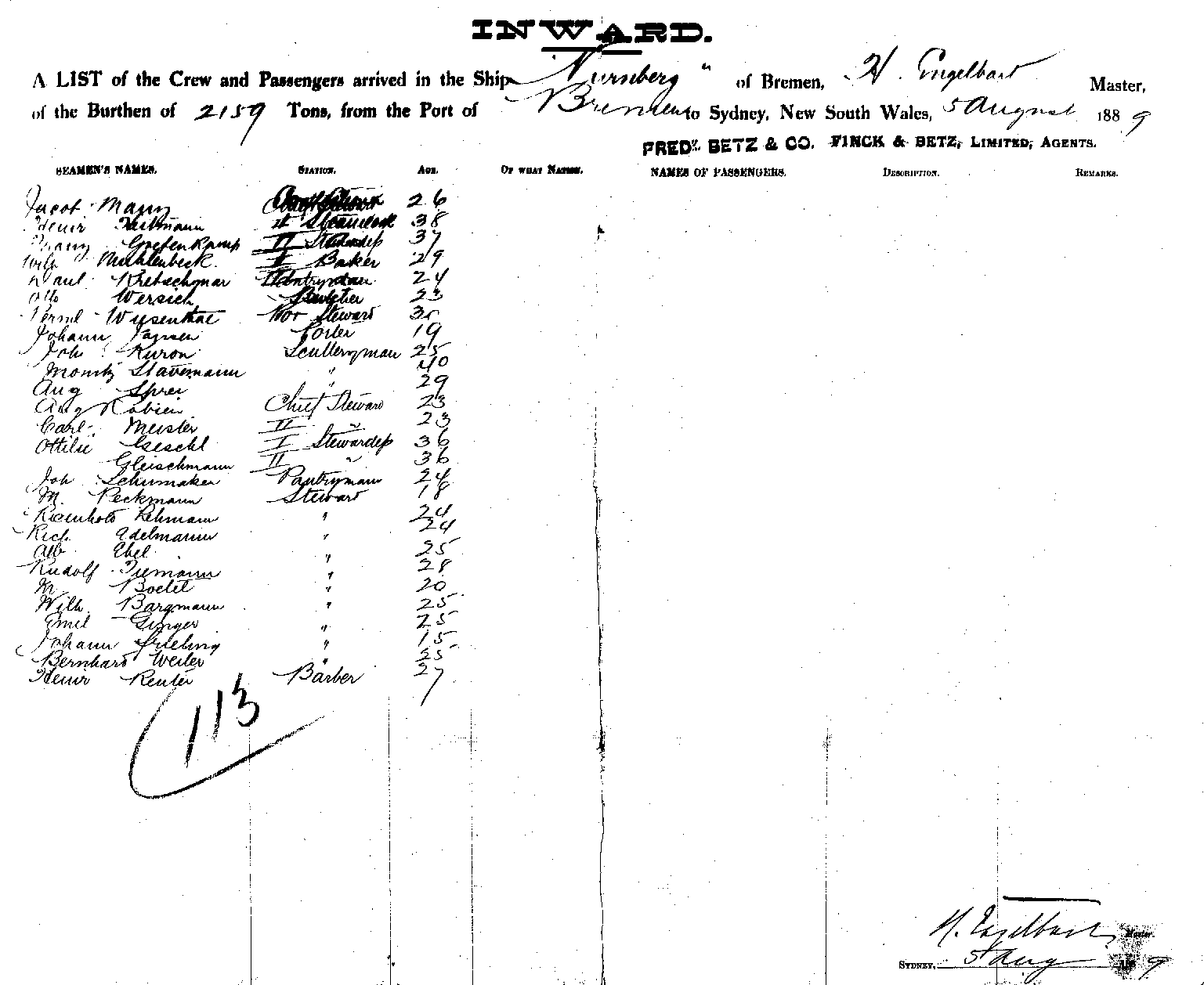 NURNBERGOF BREMEN, H. ENGELBART, MASTER, BURTHEN 2159 TONS FROM THE PORT OF BREMEN TO SYDNEY, NEW SOUTH WALES, 5TH AUGUST, 1889 |