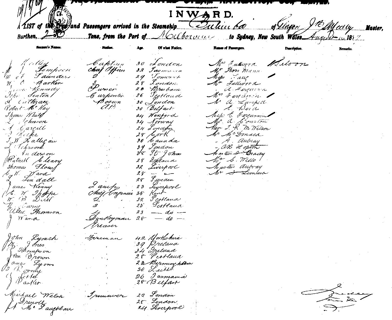 BULIMBASTEAMSHIP OF GLASGOW, J. B. MEDLEY, MASTER, BURTHEN 2513 TONS FROM THE PORT OF MELBOURNE TO SYDNEY, NEW SOUTH WALES, 16TH AUGUST, 1889 |