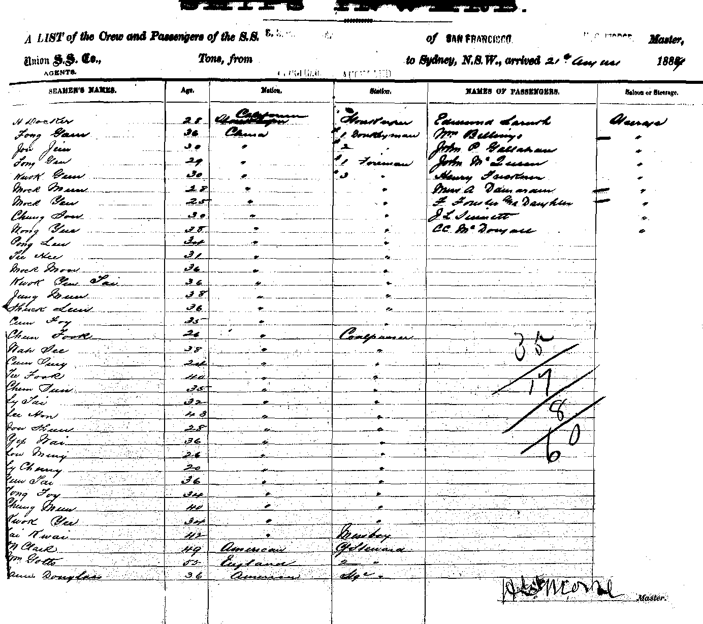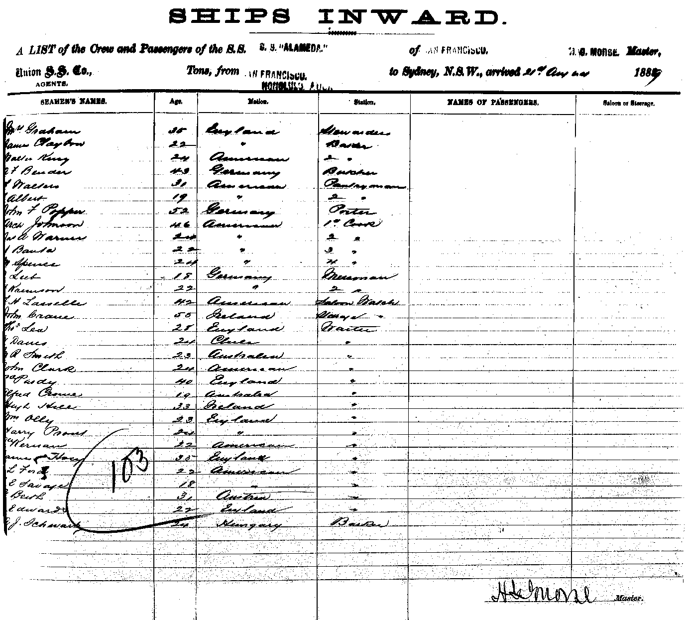 ALAMEDASTEAMSHIP OF SAN FRANCISCO, H. G. MORSE, MASTER, BURTHEN ? TONS FROM THE PORT OF SAN FRANCISCO, HONOLULU & AUCKLAND TO SYDNEY, NEW SOUTH WALES, 21ST AUGUST, 1889 |