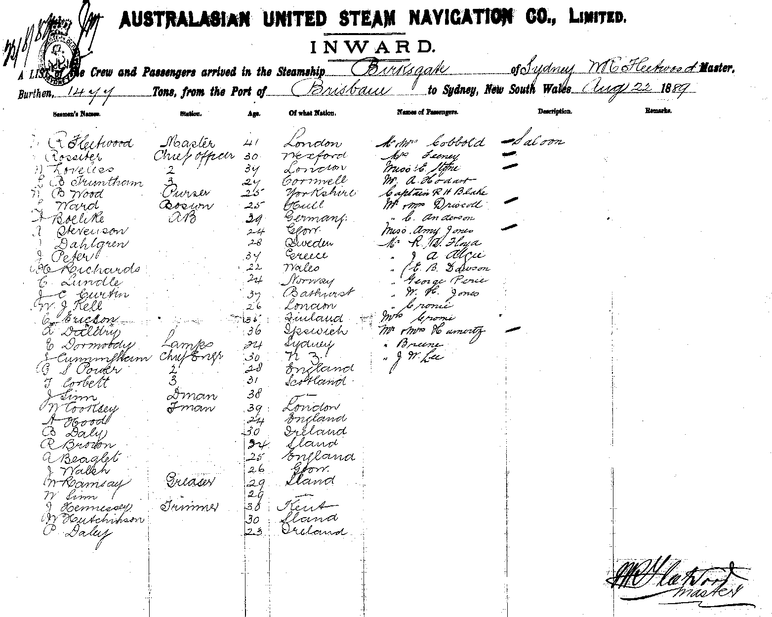 BIRKSGATESTEAMSHIP OF SYDNEY, W. R. FLEETWOOD, MASTER, BURTHEN 1477 TONS FROM THE PORT OF BRISBANE TO SYDNEY, NEW SOUTH WALES, 22ND AUGUST, 1889 |