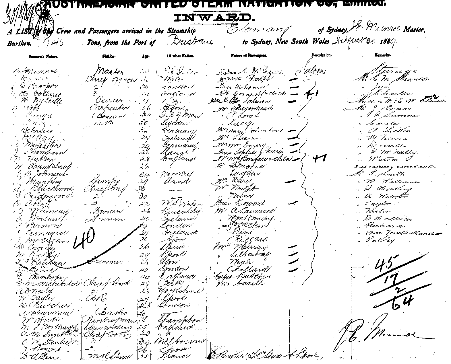 ELAMANGSTEAMSHIP OF SYDNEY, J. E. MUNRO, MASTER, BURTHEN 946 TONS FROM THE PORT OF BRISBANE TO SYDNEY, NEW SOUTH WALES, 30TH AUGUST, 1889 |