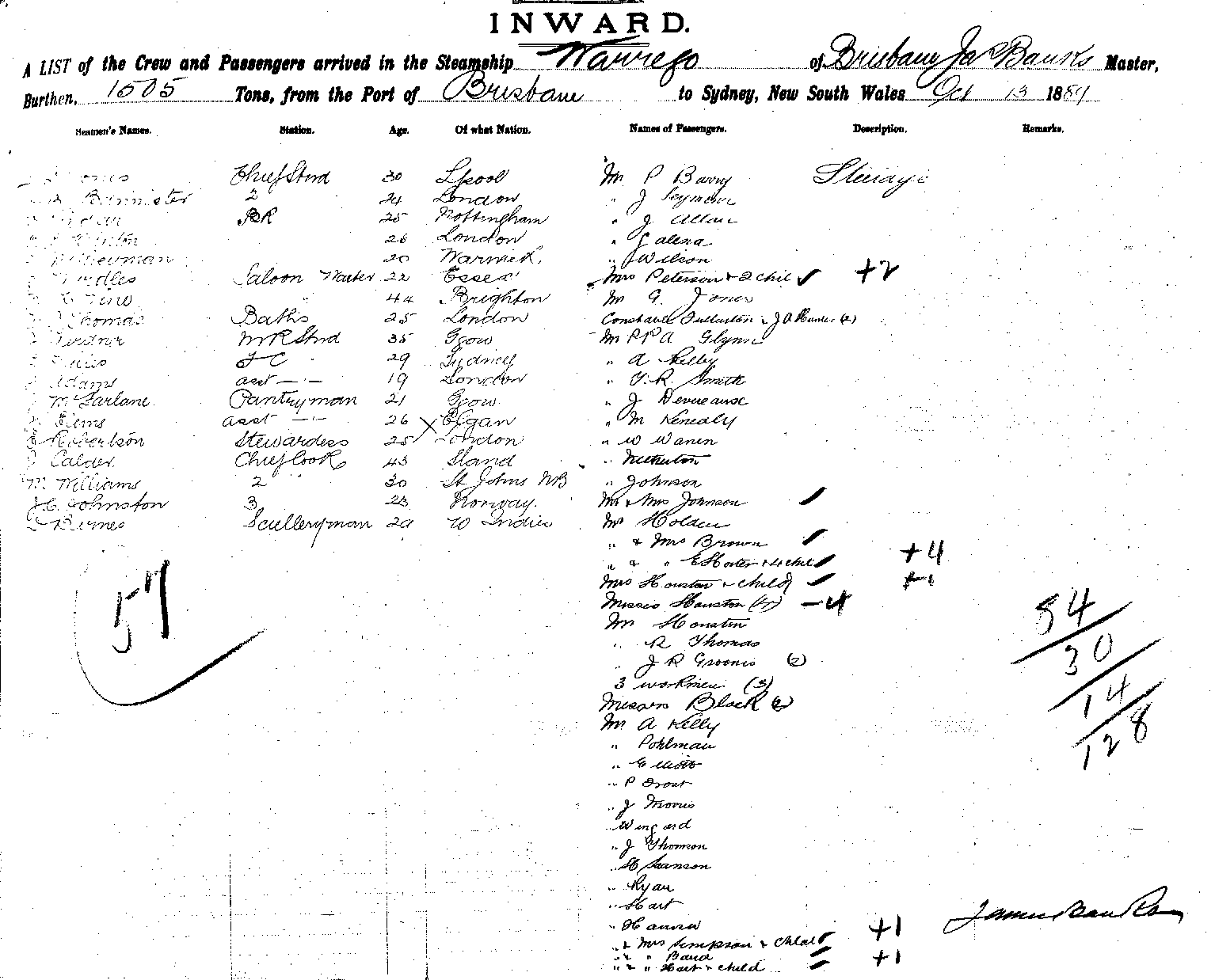 Source: State Records Authority of New South Wales: Shipping Master's Office; Passengers Arriving 1855 - 1922; NRS13278, [X201] reel 493. Transcribed by Jack Batchler. You may view/print a scan of the original list  - a monitor set to high resolution is recommended for clarity. Use your back button to return. |