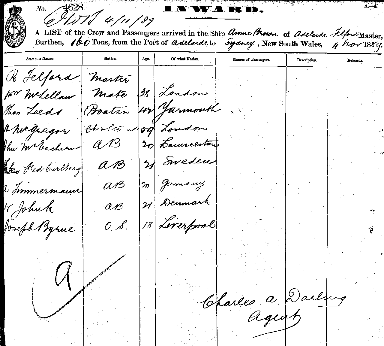 ANNE BROWNOF ADELAIDE, TELFORD, MASTER BURTHEN 160 TONS FROM THE PORT OF ADELAIDE TO SYDNEY. NEW SOUYH WALES, 4TH NOVEMBER 1889 |