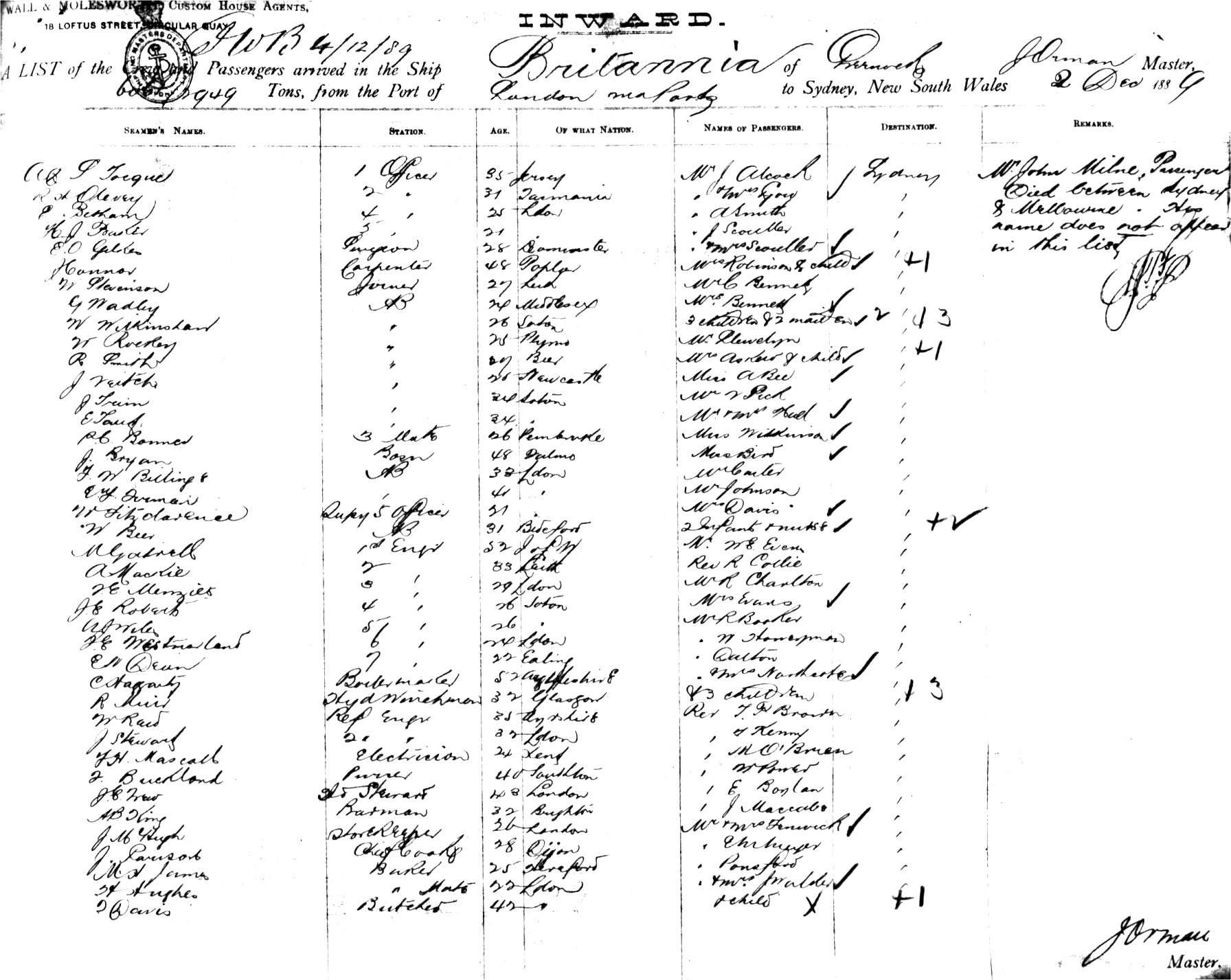 BRITANNIAOF GREENOCK, J. ORMAN, MASTER, BURTHEN 6061/5949 TONS FROM THE PORT OF LONDON VIA PORTS TO SYDNEY, NEW SOUTH WALES, 2 DEC 1889 |